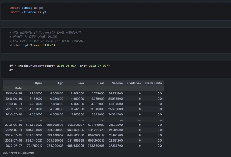 이제 데이터 불러오는 것은 어렵지 않습니다. yfinance 라이브러리를 사용해 테슬라(TSLA) 주가 정보를 가져오겠습니다. stocks 인스턴스를 생성했고, 객체 내에 내장된 history() 함수로 2010년부터 최근 데이터까지 가져왔습니다. (작성 시점: 2022-07)