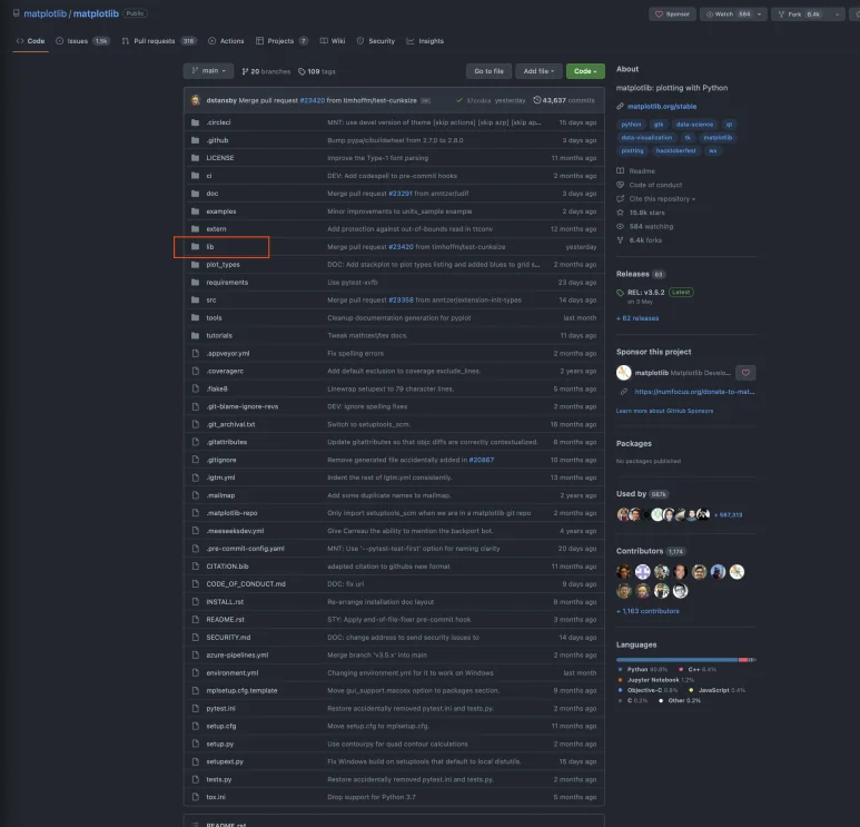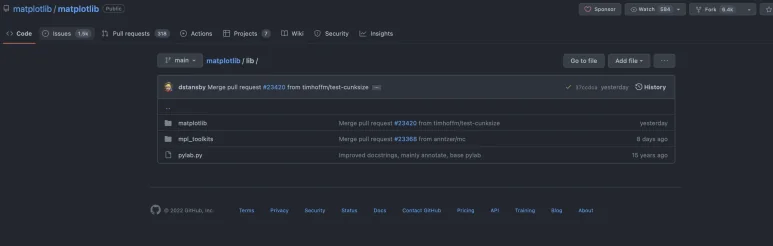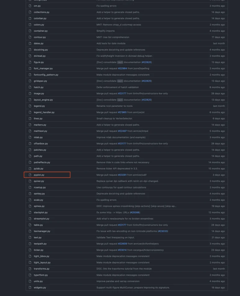 처음 보는 라이브러리를 사용하게 되면 어떻게 구현되어 있는지 깃허브 등을 통해 살펴보면 좋습니다. 모든 라이브러리마다 들여다보는 것은 효용이 좋지 않겠지만, 관심을 가지고 여유로울 때 살펴보면 라이브러리를 유연하게 잘 사용하는 데에 많은 도움이 될 것입니다. matplotlib은 한 번 내부를 먼저 살펴보도록 하겠습니다.