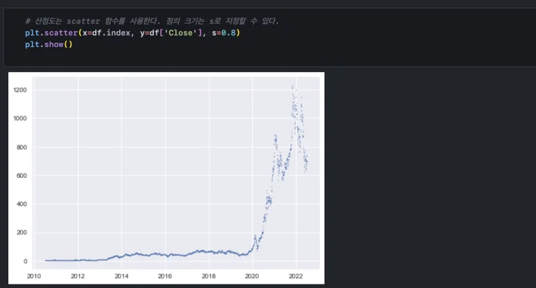 pyplot은 단순 선형 그래프 외에도 다양한 그래프를 지원합니다. 데이터가 흩어진 정도를 보여주는 산점도는 시계열 데이터 상에서 얼마나 밀집해있는가를 확인하기 위해서도 쓰입니다. 산점도를 그리려면 scatter() 함수를 사용하면 됩니다.