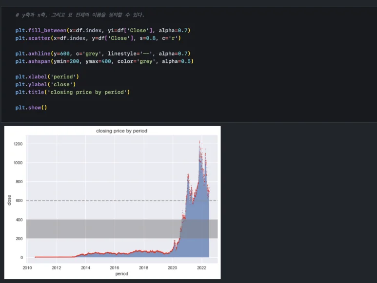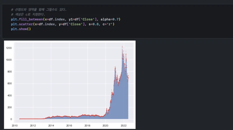 fill_between() 함수와 scatter() 함수의 실행 결과를 한 번에 보여줄 수도 있습니다. plt.show()가 ‘그려라’라는 역할을 하기 때문에 순서대로 작성해 주고 마지막에 plt.show() 함수만 실행해 주면 됩니다.