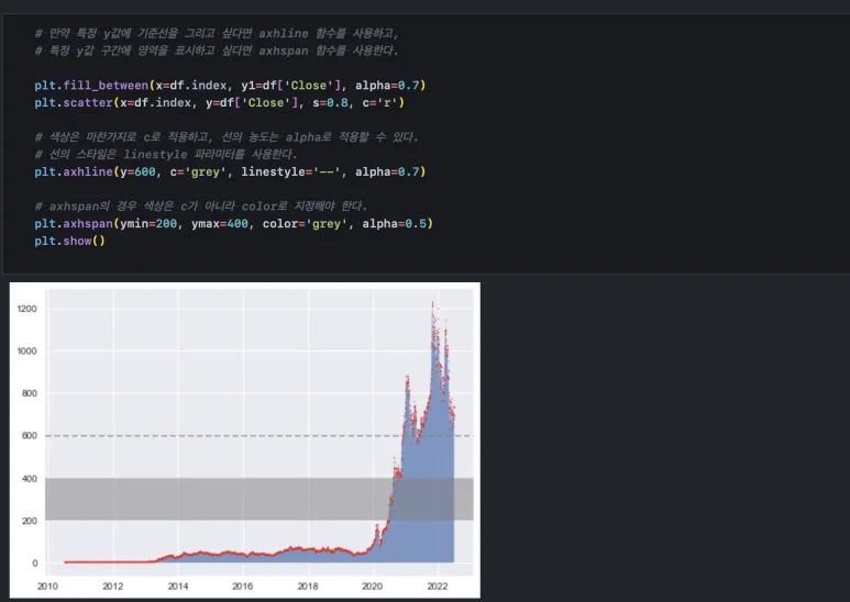 우리가 프레젠테이션을 하거나 어떤 설명을 할 때, 차트를 놓고 x축 혹은 y 축에 기준선을 표기해 줄 때가 많습니다. 이럴 때에는 axvline(), axhline() 함수를 사용할 수 있습니다. 만약 기준선이 아니라 기준 영역을 그리고 싶다면 axvspan(), axhspan() 함수를 사용하면 됩니다. 색상과 스타일 등은 아래와 같이 파라미터로 적용할 수 있습니다.