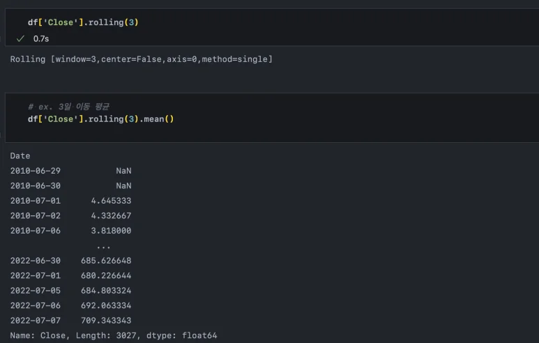 이동평균 데이터는 파이썬으로도 간단하게 확인할 수 있습니다. Close(종가)에 대해 rolling(n) 함수를 적용하면 n 일에 대한 통계치를 계산할 수 있는 객체가 됩니다. 이 객체는 n 일간의 데이터를 담고 있으며 min(), std(), median(), mean() 함수를 통해 n 일간의 통계치를 계산할 수 있습니다. 여기서는 mean() 함수를 사용해 간단히 3일 이동평균 데이터를 구해보았습니다.