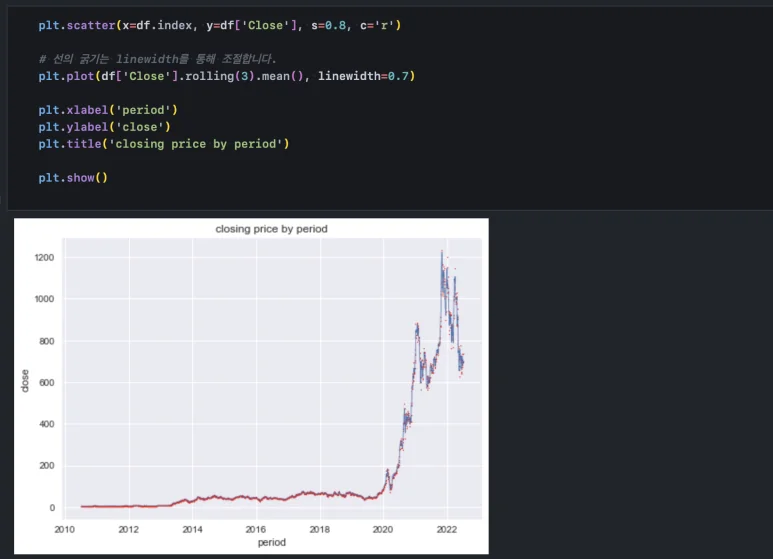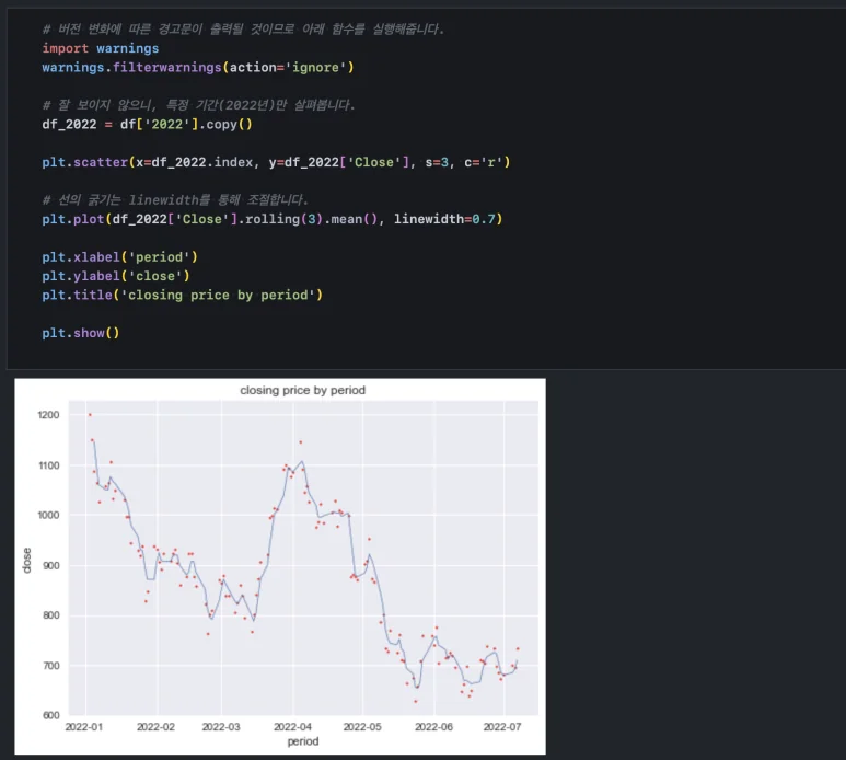 fill_between()과 scatter() 함수로 차트를 겹쳐 그릴 수 있었던 것처럼 이동평균선도 산점도와 함께 그릴 수 있습니다.