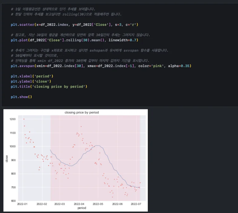 이번에는 30일 이동 평균 그래프를 그려볼 것입니다. rolling(n) 함수에 n만 바꿔주면 됩니다. 30일 치 이동평균이기 때문에 첫 29일까지는 평균값이 없습니다. axvspan() 함수를 통해 평균값이 있는 기간을 같이 표시해 보겠습니다.