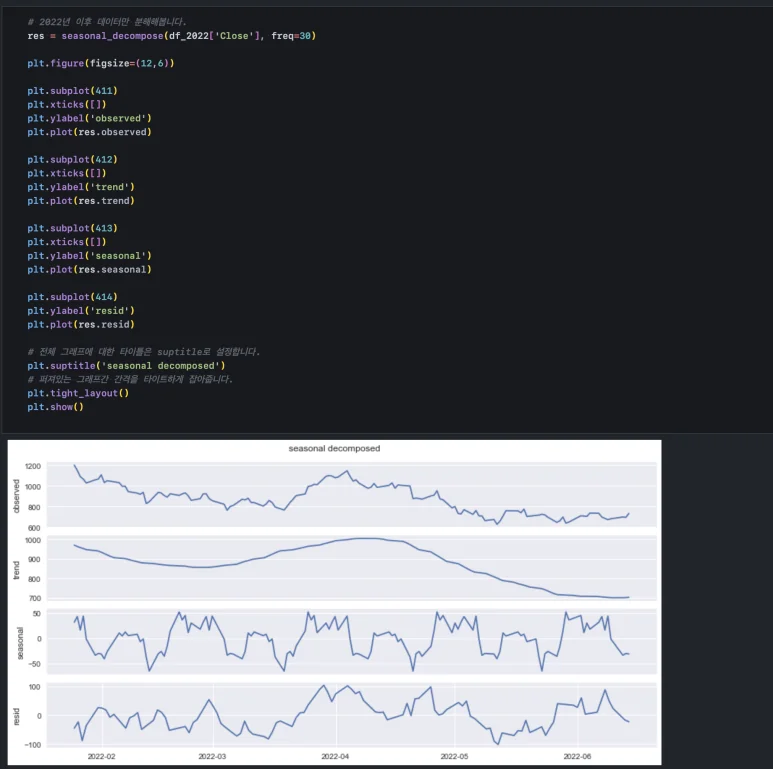 여기서 주의 깊게 봐야 하는 부분은 ‘잔차(resid)’인데, 잔차가 2020년 이전과 2022년 이전, 이후 움직임이 크게 다릅니다. 이렇게 잔차의 움직임 변화가 눈에 잘 보이면 제대로 패턴을 추출해 내지 못한 것입니다. 잔차는 앞에서 언급한 것처럼 ‘무작위성’을 보여야 하기 때문입니다. 진폭이 점점 커지는 것도 ‘발견 가능한 패턴’의 일종입니다.