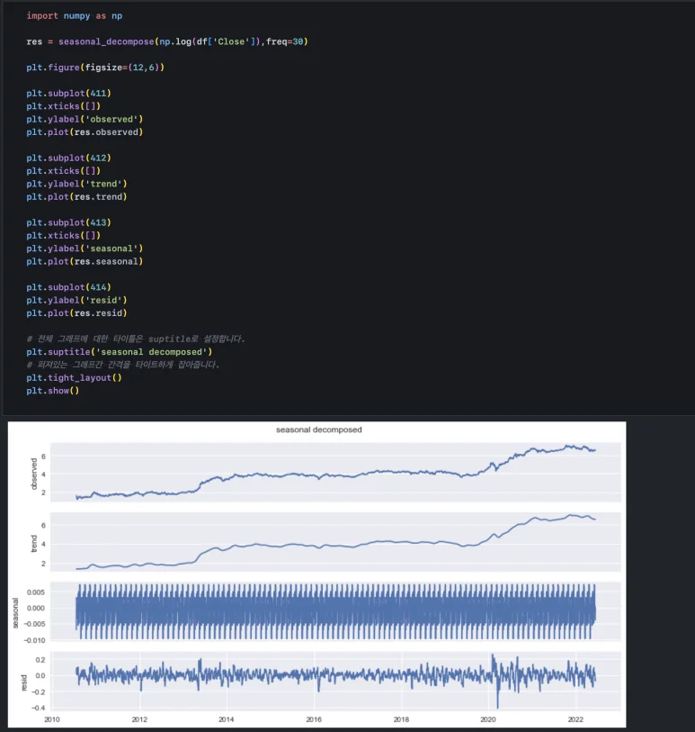시계열 데이터에는 이렇게 이동평균으로 확인할 수 있는 추세만 있는 것이 아니라 계절성과 잔차라는 요소가 있습니다. 계절성은 관측치(observed, 주가)에서 추세(trend)를 제거하고 남은 데이터 중 반복되는 패턴을 잡아서 보여주며 잔차(residual, resid)는 계절성까지 제거되고 남은 값을 보여줍니다. 따라서 잔차에서는 특정 반복 패턴, 커지거나 작아지는 움직임, 급격히 튀는 구간 등이 남아 있으면 안 됩니다. 모든 패턴과 움직임이 추출되고 남은 ‘나머지’는 random, 즉 무작위적 변동성이어야 하기 때문입니다.