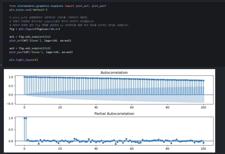 plot_pacf()는 partial auto-correlation을 계산합니다. partial auto-correlation은 편 자기상관성으로, 오늘과 어제, 오늘과 그제와 같이 오늘을 기준으로 1~n 개 단위(하루~n 일)의 상관성을 보여줍니다. 함수를 사용할 때 lags 파라미터를 지정해 주었는데, 오늘로부터 과거 100일까지의 상관관계를 보여달라고 한 것입니다.