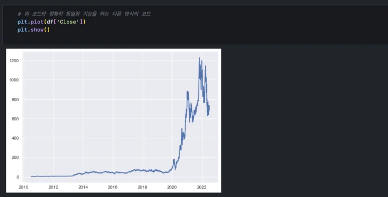 우리는 df 변수에 데이터 프레임을 담았습니다. ‘Close’컬럼만 불러와서 데이터 프레임에 내장된 plot() 함수를 사용해 주면 이렇게 차트가 그려집니다. 이때, x축은 df의 인덱스, y 축은 ‘Close’ 변수가 됩니다.