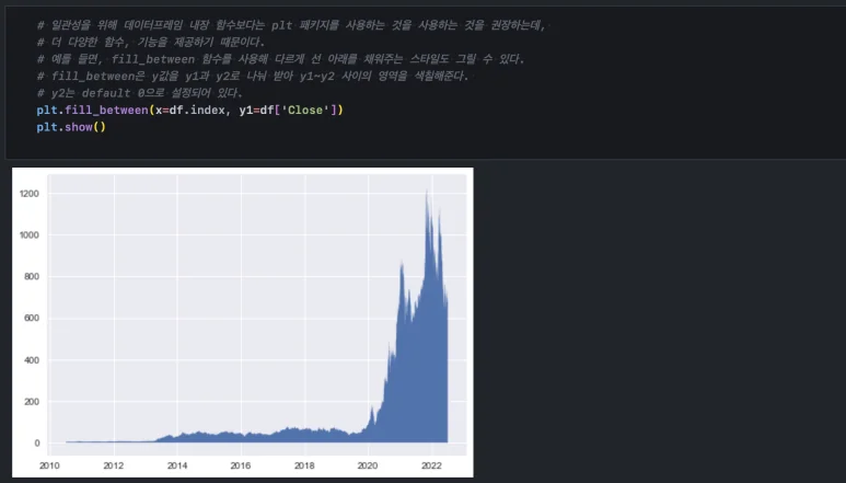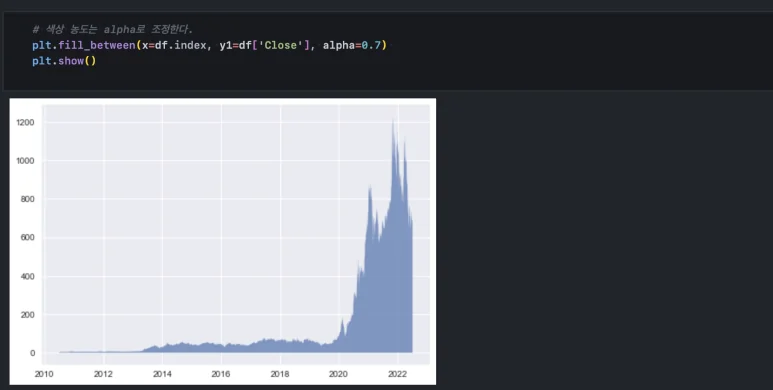 pyplot()의 fill_between() 함수를 사용하면 plot() 함수를 사용했을 때 생기는 선형 그래프 아래 영역을 채워줄 수 있습니다.