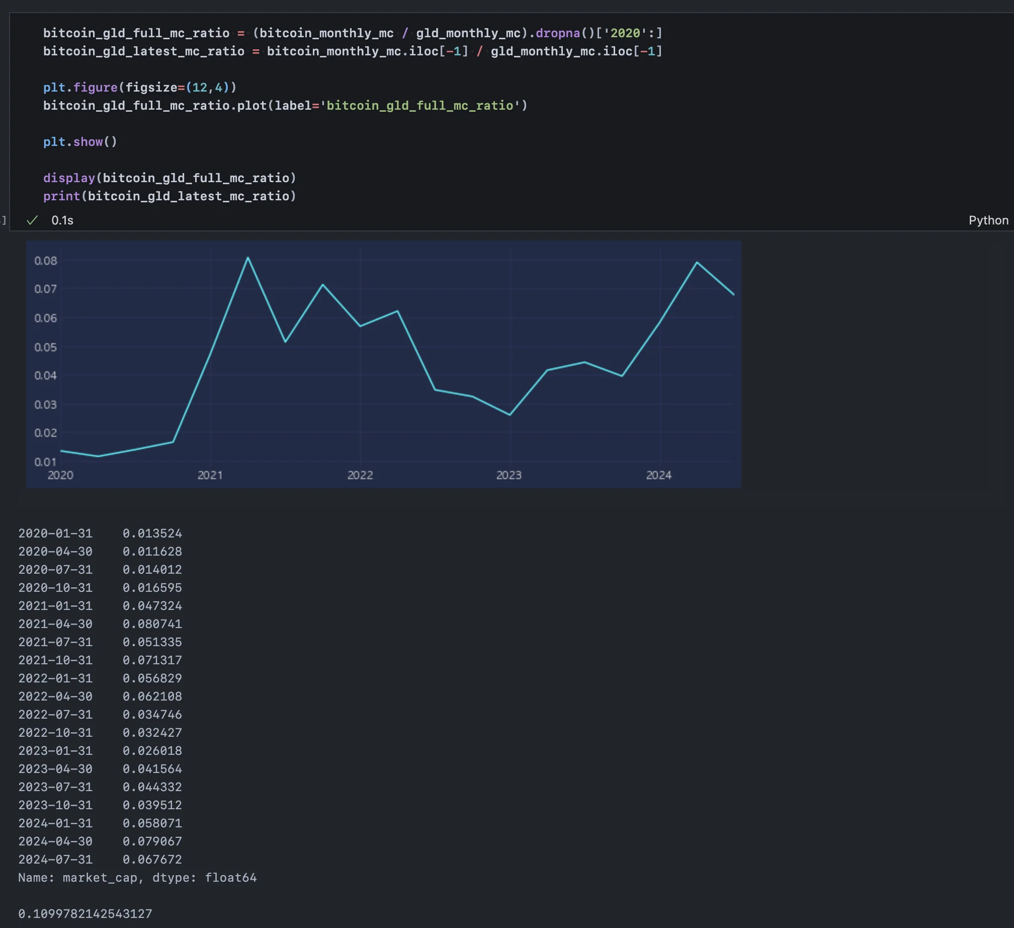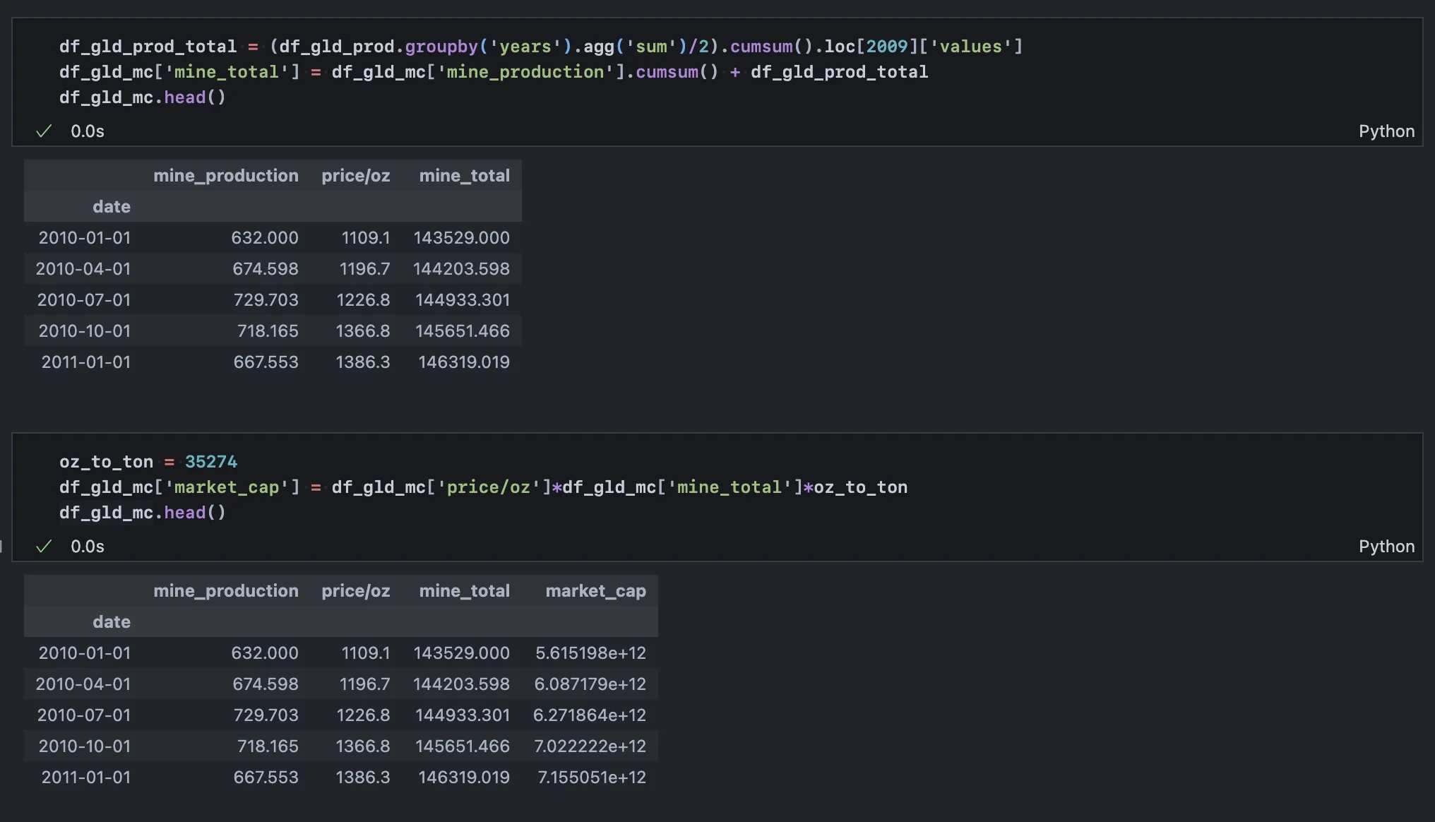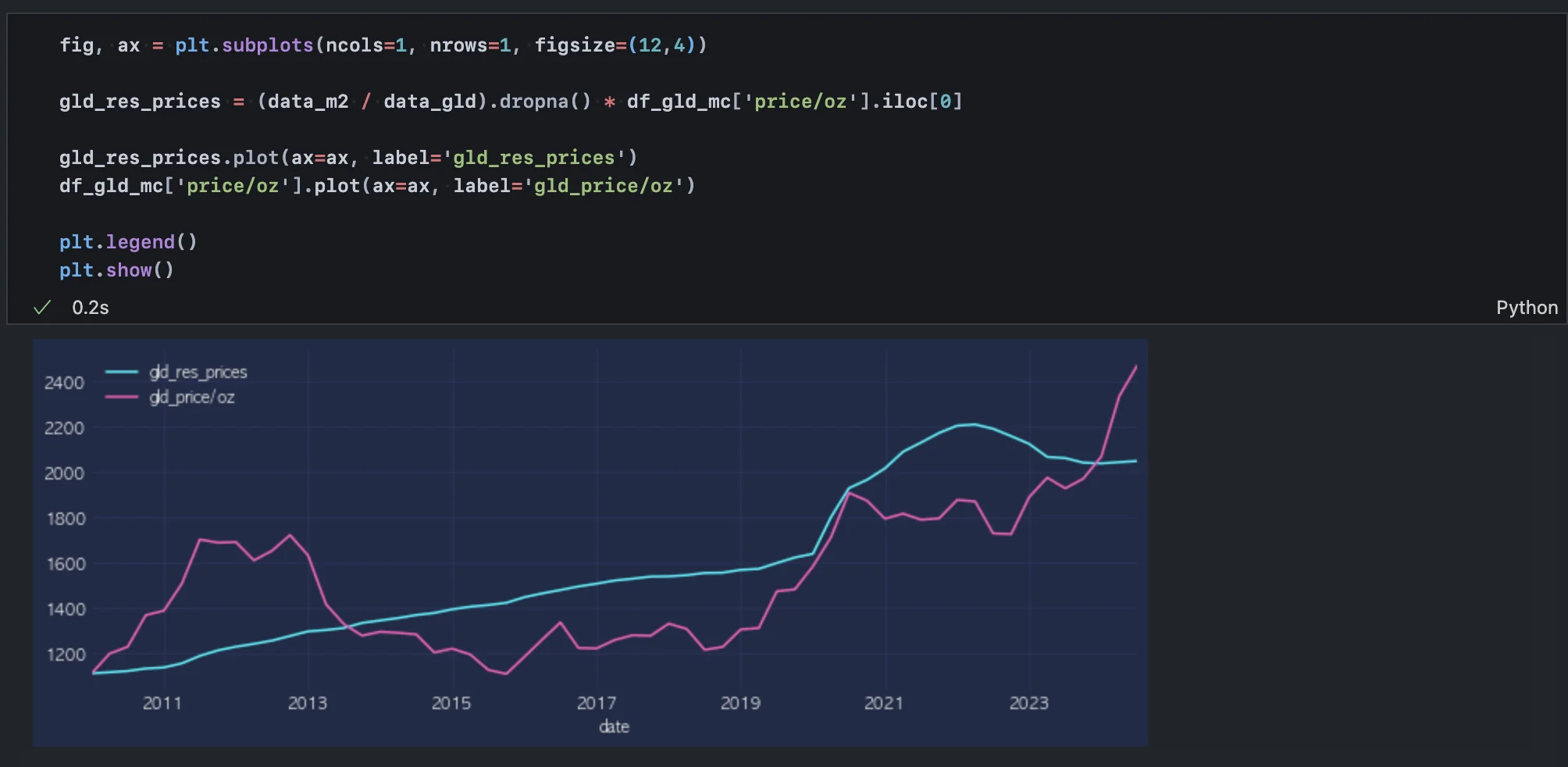 위 작업을 통해 2024년 3분기까지의 금 가격 및 시총 데이터를 모두 추출했다.