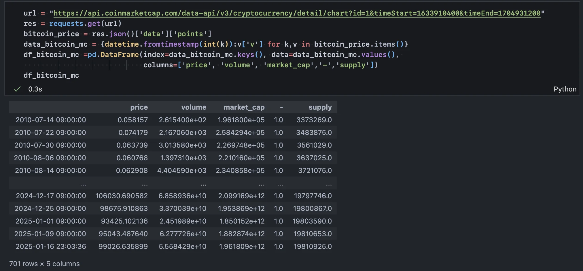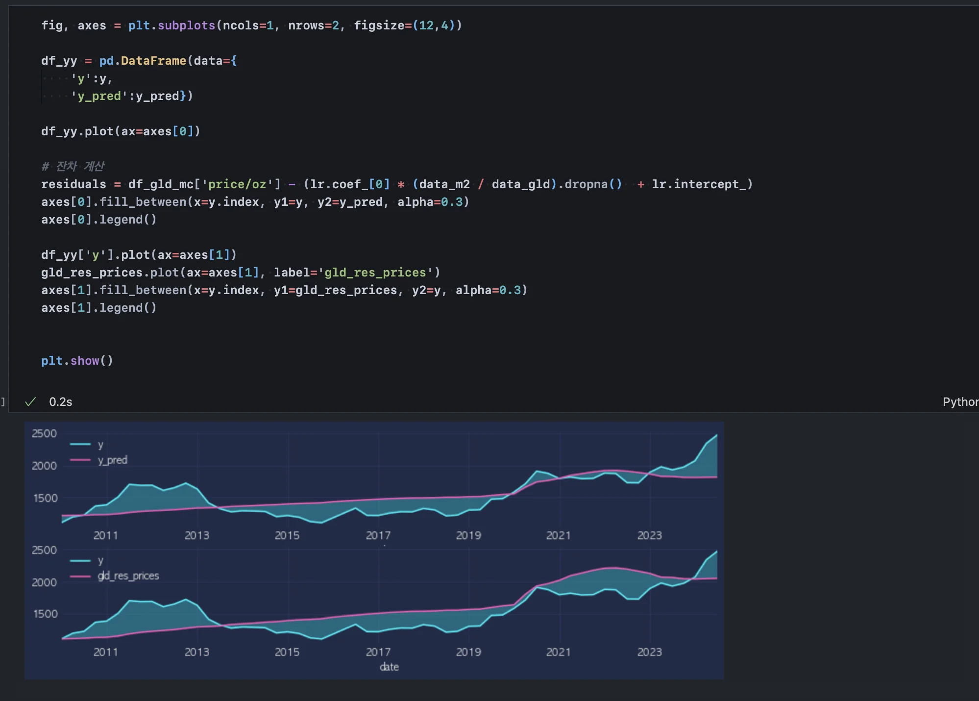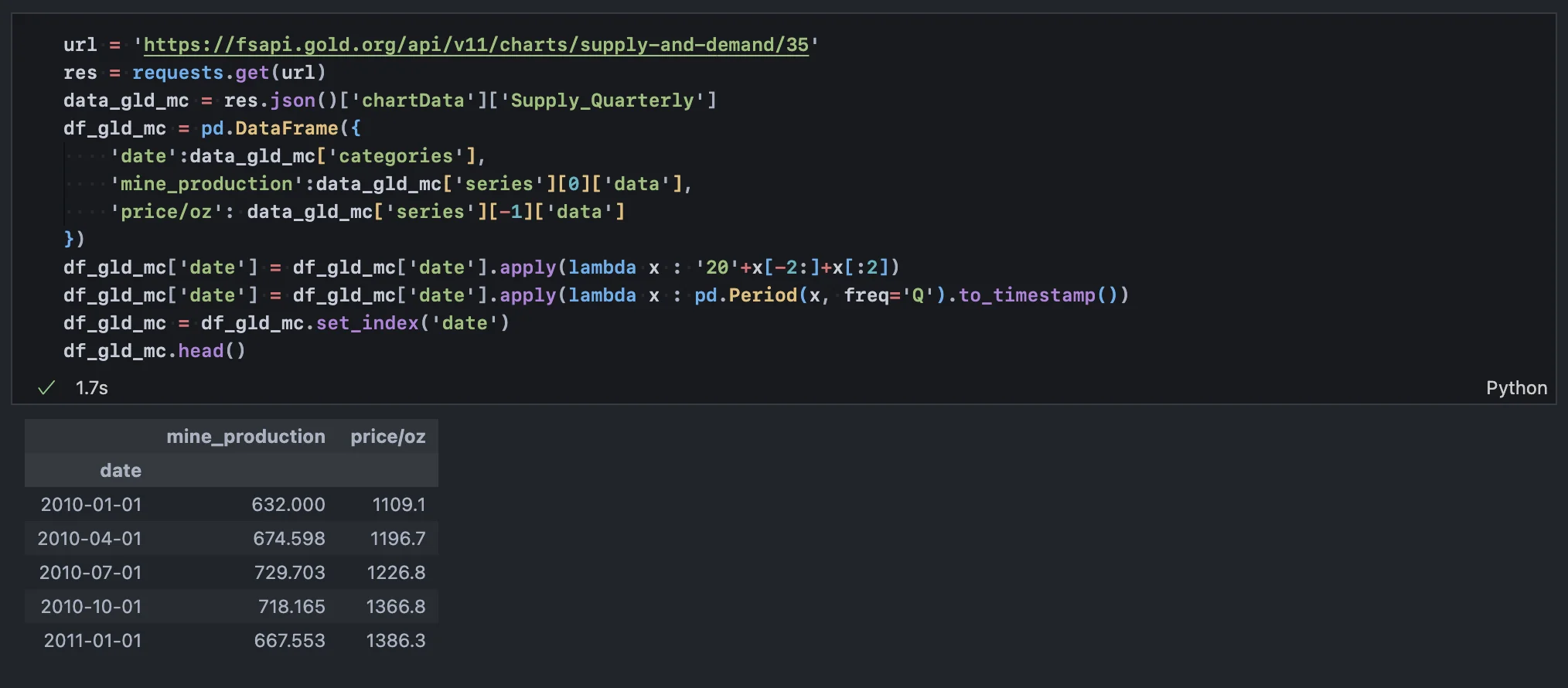 위 작업을 통해 2024년 3분기까지의 금 가격 및 시총 데이터를 모두 추출했다.