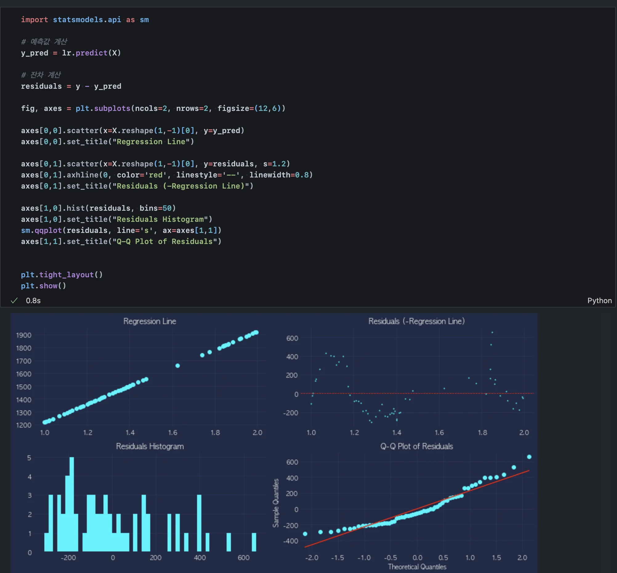 위 차트에서 잔차들이 x축에 대해 무작위로 분포해야 이상적인 회귀 모델이지만 여기서는 잔차가 특정 패턴(곡선 형태)을 따르는 것처럼 보이며, 이는 회귀 모델이 데이터의 비선형성을 잘 설명하지 못하고 있다는 신호일 수 있다. 하지만 본 회귀 분석의 목적이 예측이 아니므로 정상성을 엄밀히 확보하기보다 단일 변수에 대한 설명력을 파악하는 데에 제한적으로 활용할 필요가 있다.