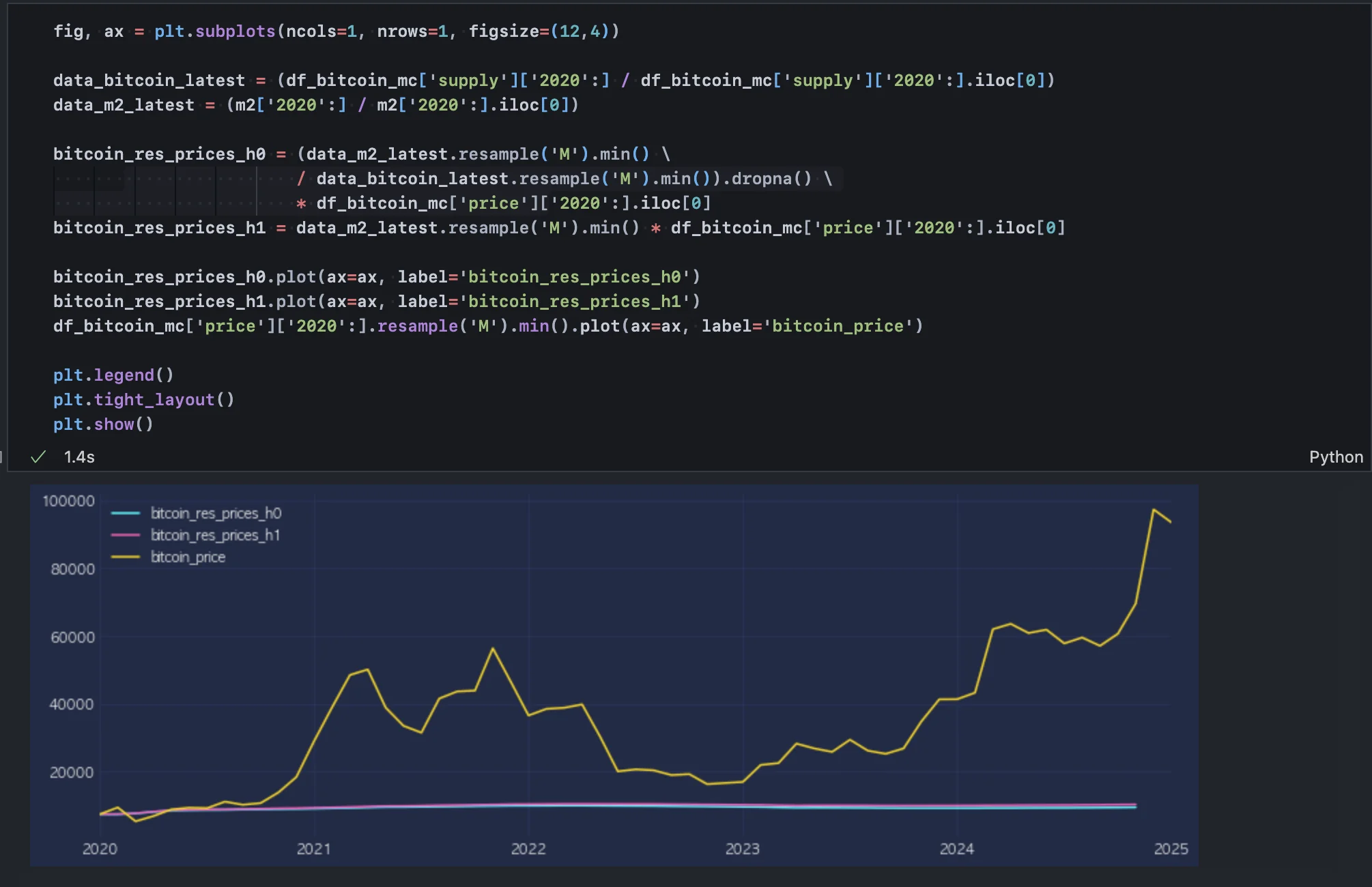 비트코인의 가격 역시 M2 증가량 대비 비트코인 공급량 증가율의 비율로 추정했지만, 결과는 금과 달리 큰 괴리를 보였다. 특히 2020년 이후 비트코인의 가격 급등은 단순한 유동성 비율로 설명되지 않을 정도로 이례적이었다.