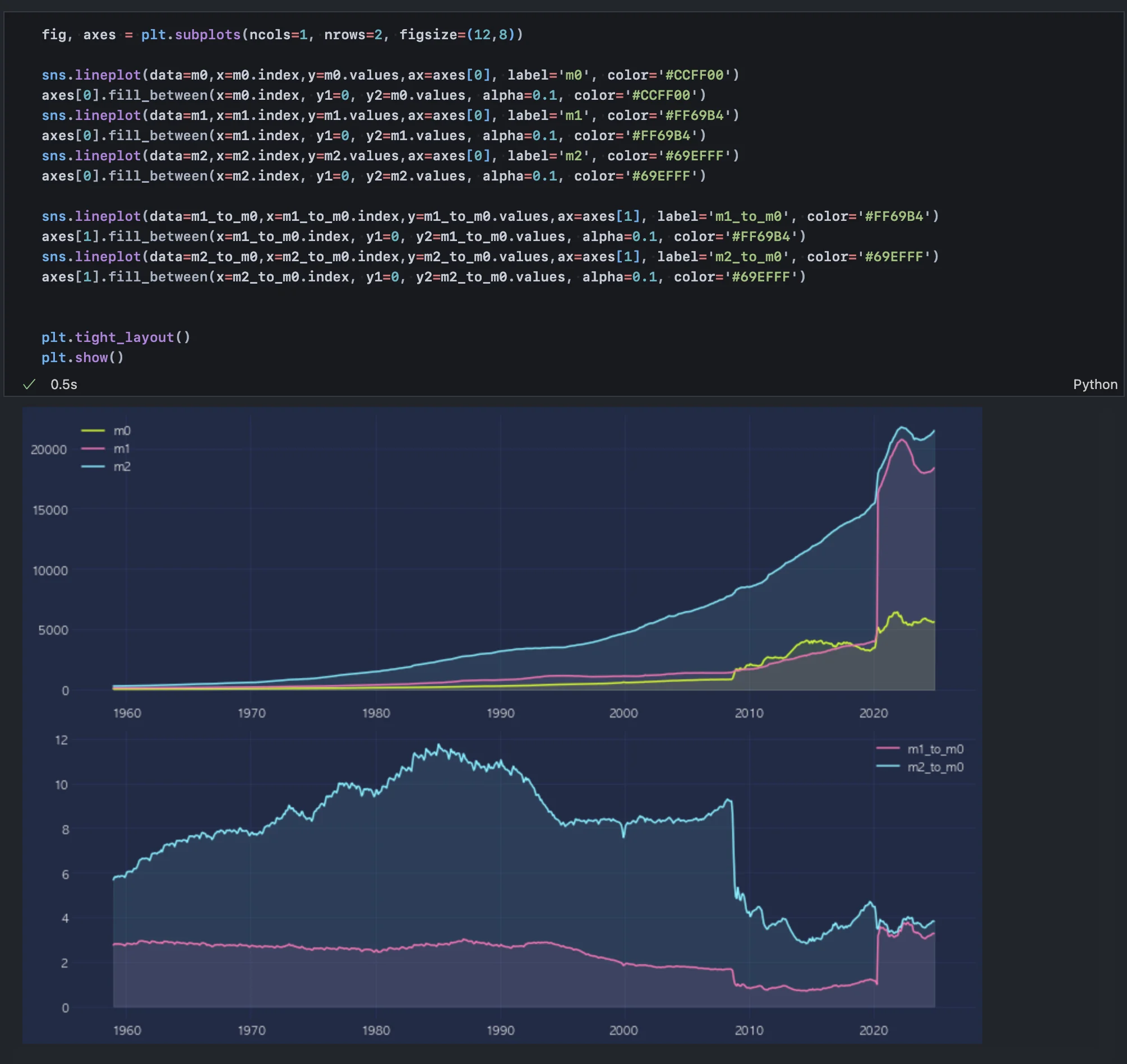 통화량 데이터를 수집하기 위해 Federal Reserve Economic Data(FRED) API를 사용하여 M0, M1, M2 데이터를 확보했다. M0는 물리적 통화(현금), M1은 현금+수표 계좌, M2는 예금 및 기타 금융 상품을 포함한 통화 지표로, 각각의 통화량은 경제의 유동성을 이해하는 데 핵심적인 역할을 한다.