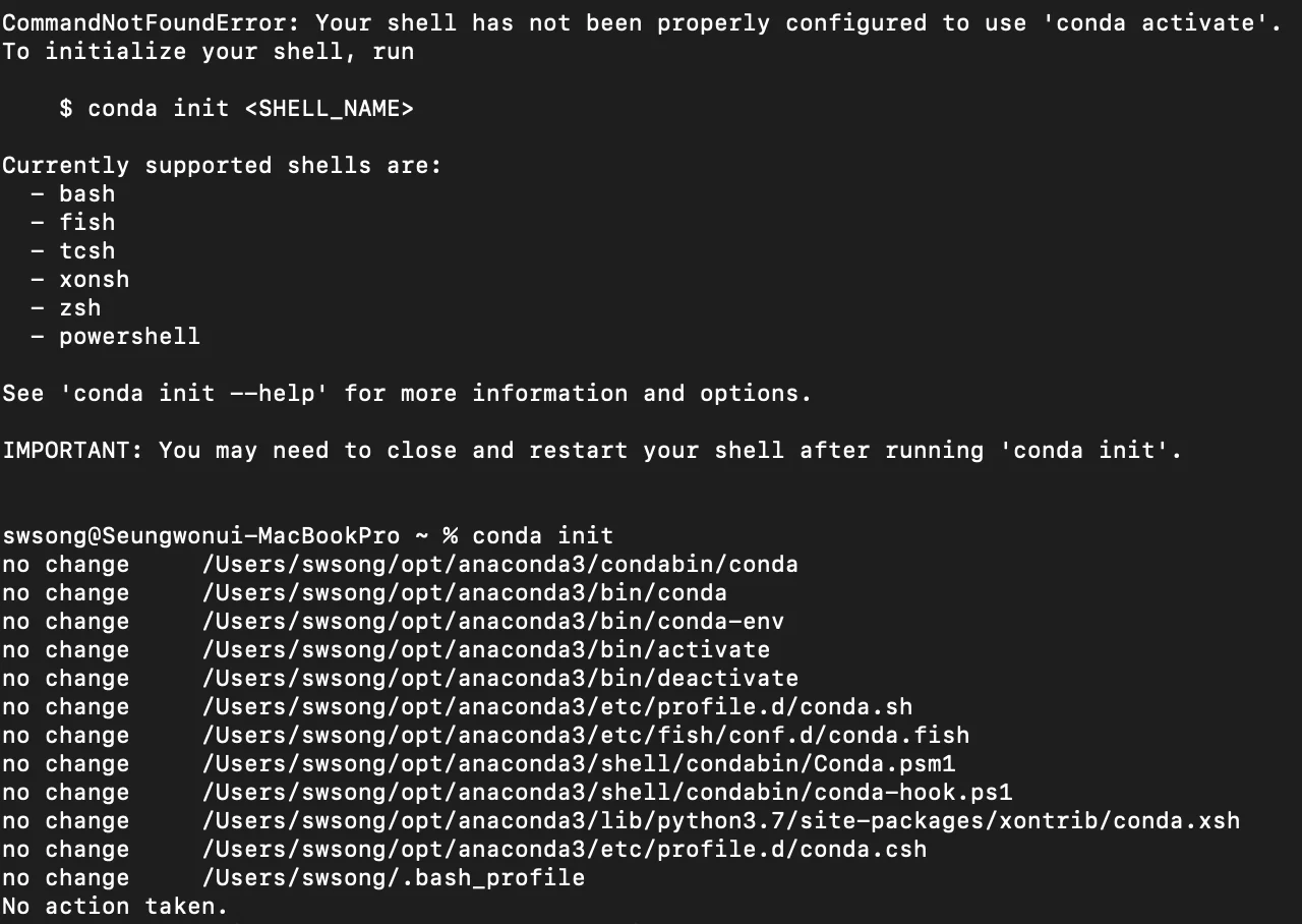 오랜만에 맥에 아나콘다를 설치하고 가상 환경을 띄우려는데, 에러가 발생했다.