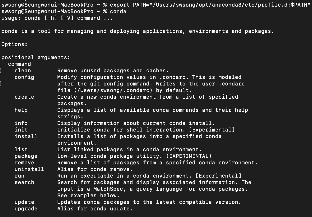 export PATH=”/Users/username/anaconda/bin:$PATH”로 설정하면 된다