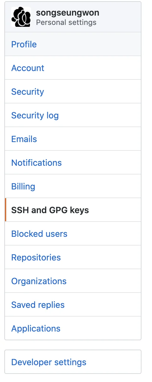 복사했다면, github 계정으로 들어가서 설정 -> SSH and GPG keys로 들어간다.