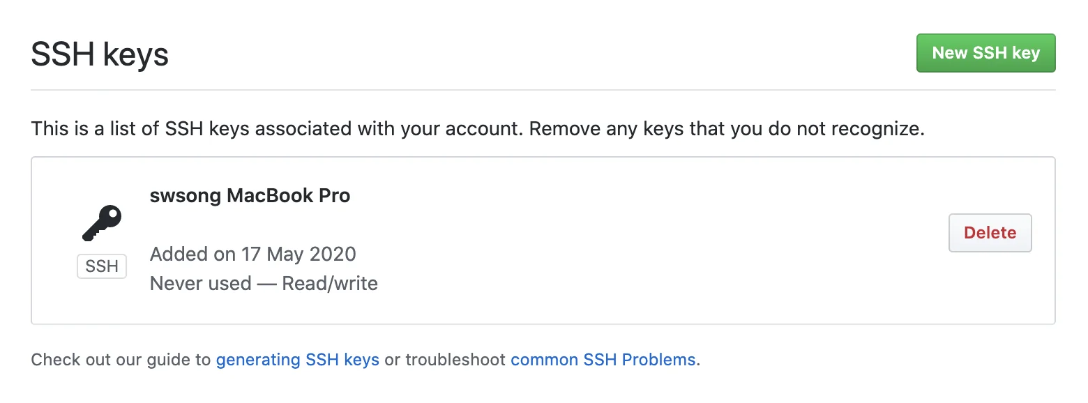 들어가서 New SSH Key를 눌러주고, 공개키 Title과 복사한 Key를 입력해준다.