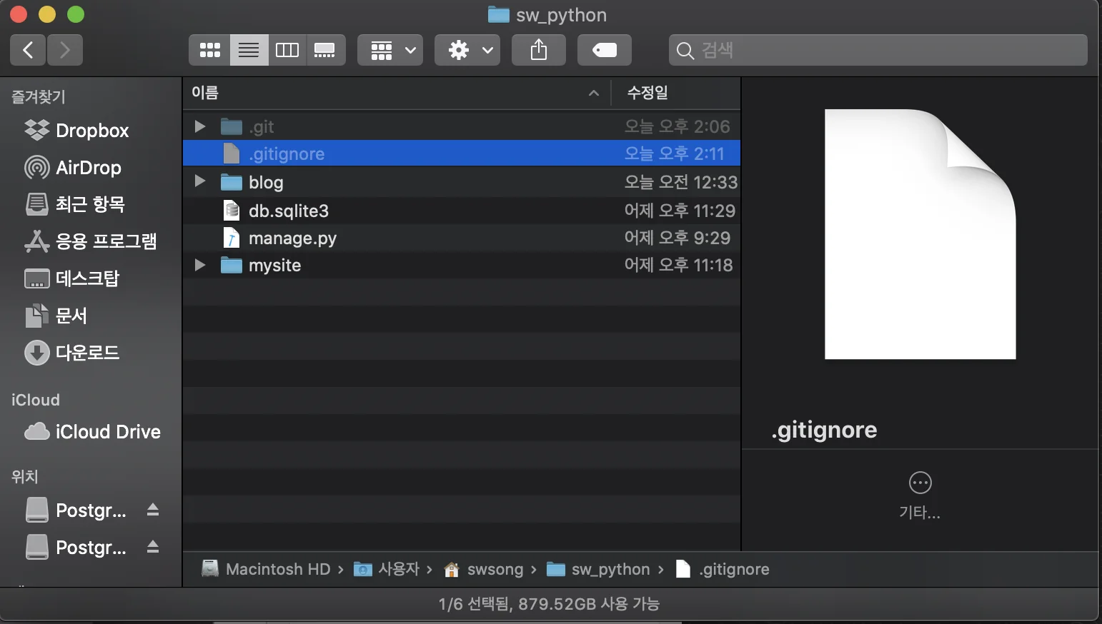 폴더 안에 .git 과 .gitignore이 사이좋게 들어가있다.