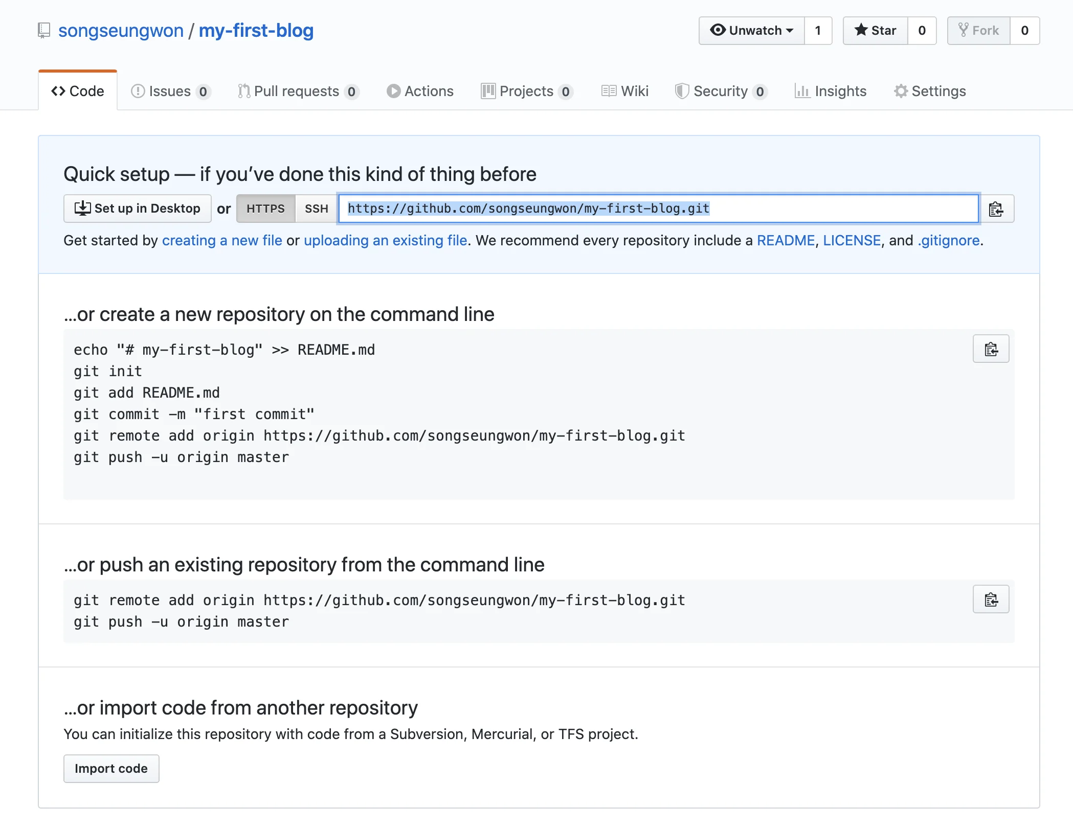 생성하면 이렇게 레포지토리 주소를 https로 확인할 수 있다. 복사해서 아래 명령어 <주소>에 넣어준다.