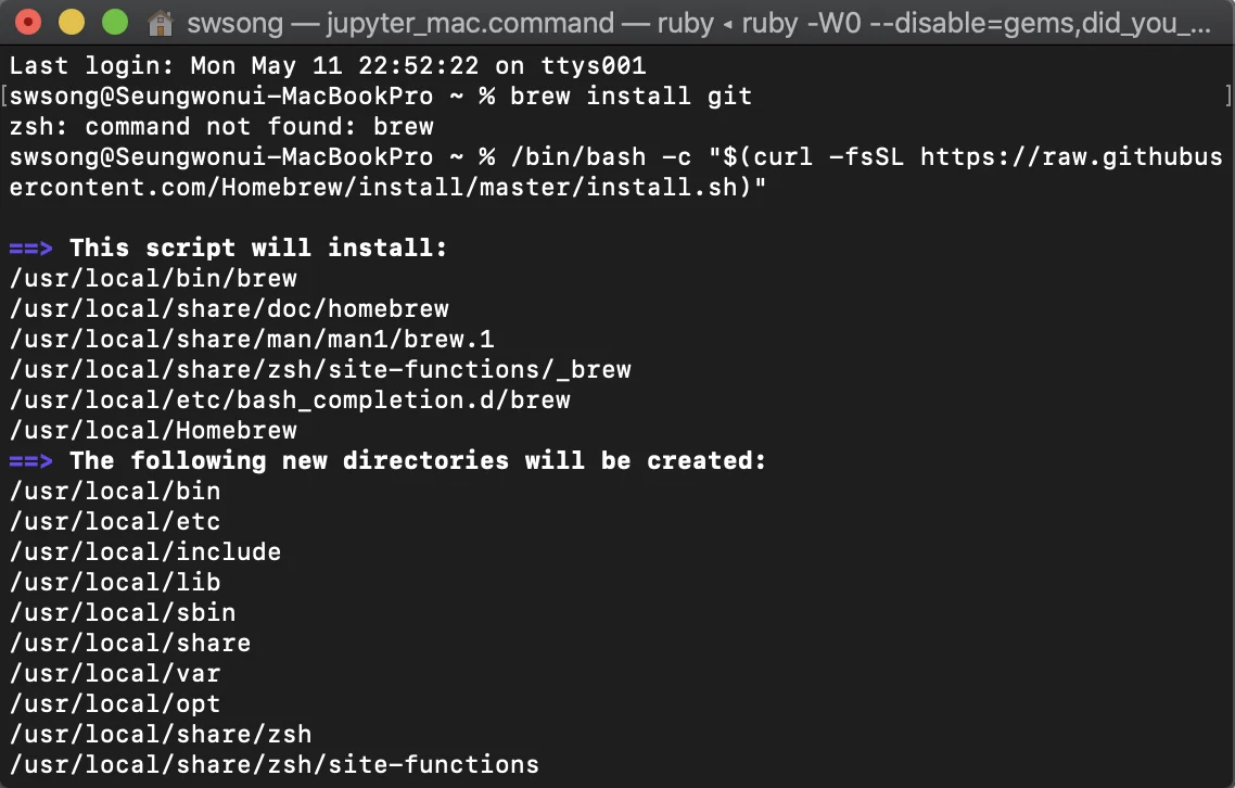 먼저 homebrew를 설치할 것이다. homebrew는 맥에서 git과 같은 다양한 툴을 편하게 설치하게 해준다.