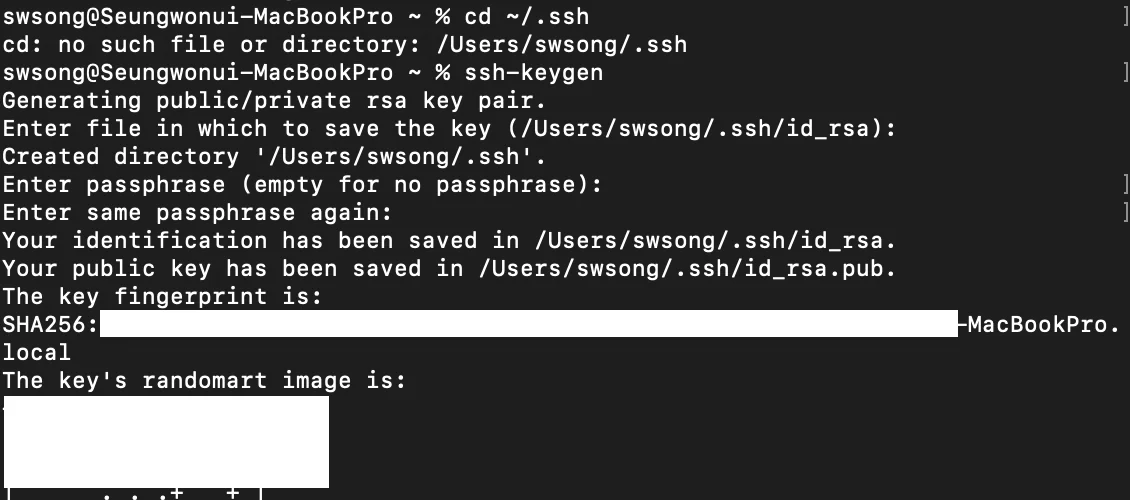 % cd ~/.ssh 를 실행했을때 파일 혹은 경로를 찾을 수 없다고 나온다면 % ssh-keygen 명령어로 key를 생성해준다.