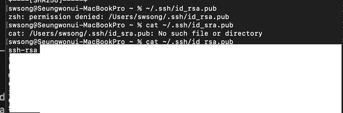 잘 생성되었는지 확인하고, ssh- 공개키 번호를 확인한다. 흰색블라인드 처리된 부분이 공개키이므로, 이를 복사해준다.(ssh-rsa부터 끝까지 모두 복사한다.)