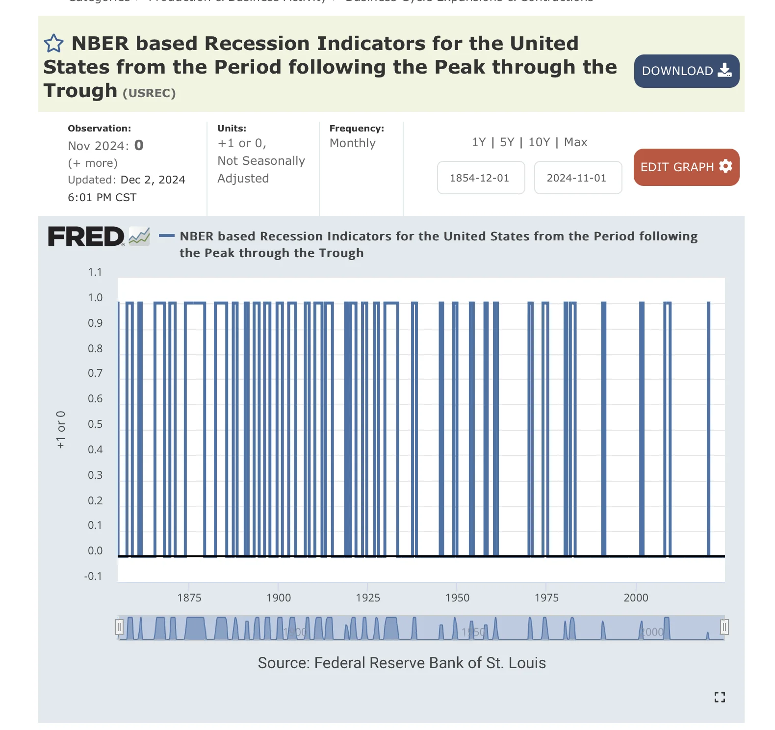 먼저 FRED API에서 미국 장단기 금리(10년물, 2년물) 데이터, 그리고 Recession(경기침체) Indicator 데이터를 불러온다. Recession Indicator Ticker는 USREC이며, 아래 이미지와 같이 지난 연도별 경기침체 여부를 1 or 0으로 기록하고 있다.