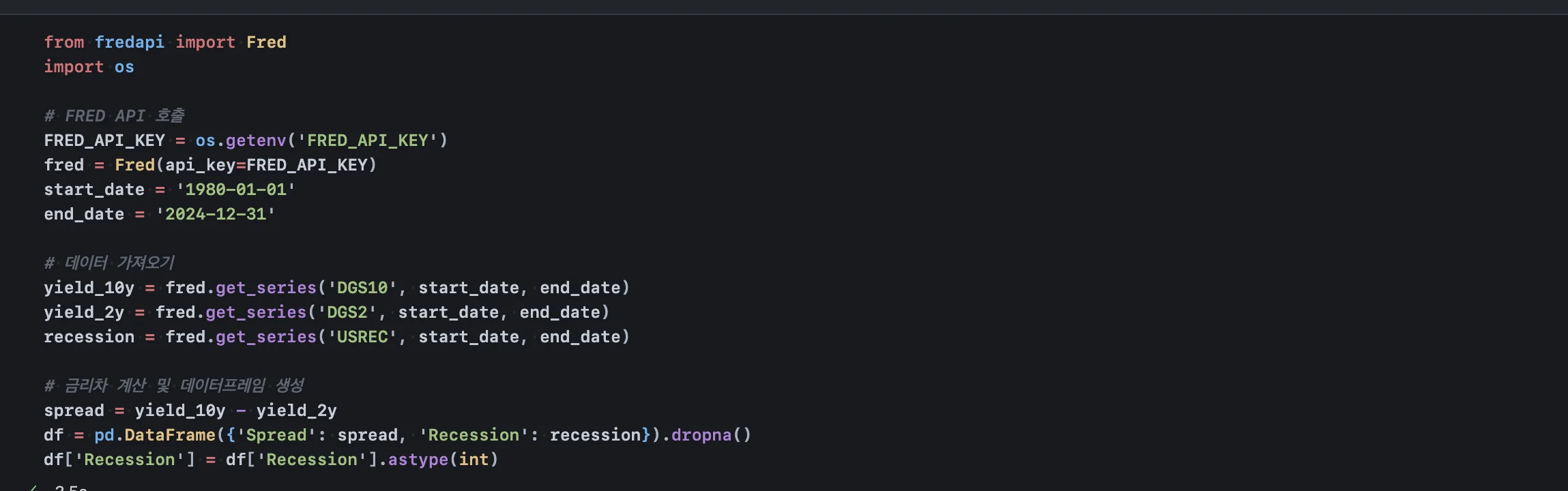 따라서 시계열 모델 파라미터를 분리 해석할 수 있는 ARIMA 모형, 종속변수가 binary(이진) 변수일 때 yes or no 에 대한 발생 확률을 가장 단순하게 설명가능한 Probit 모형을 사용하고, 이를 통해 현재의 미국채 Spread로 미래 경기침체 향방을 추정 시도해보려 한다.
