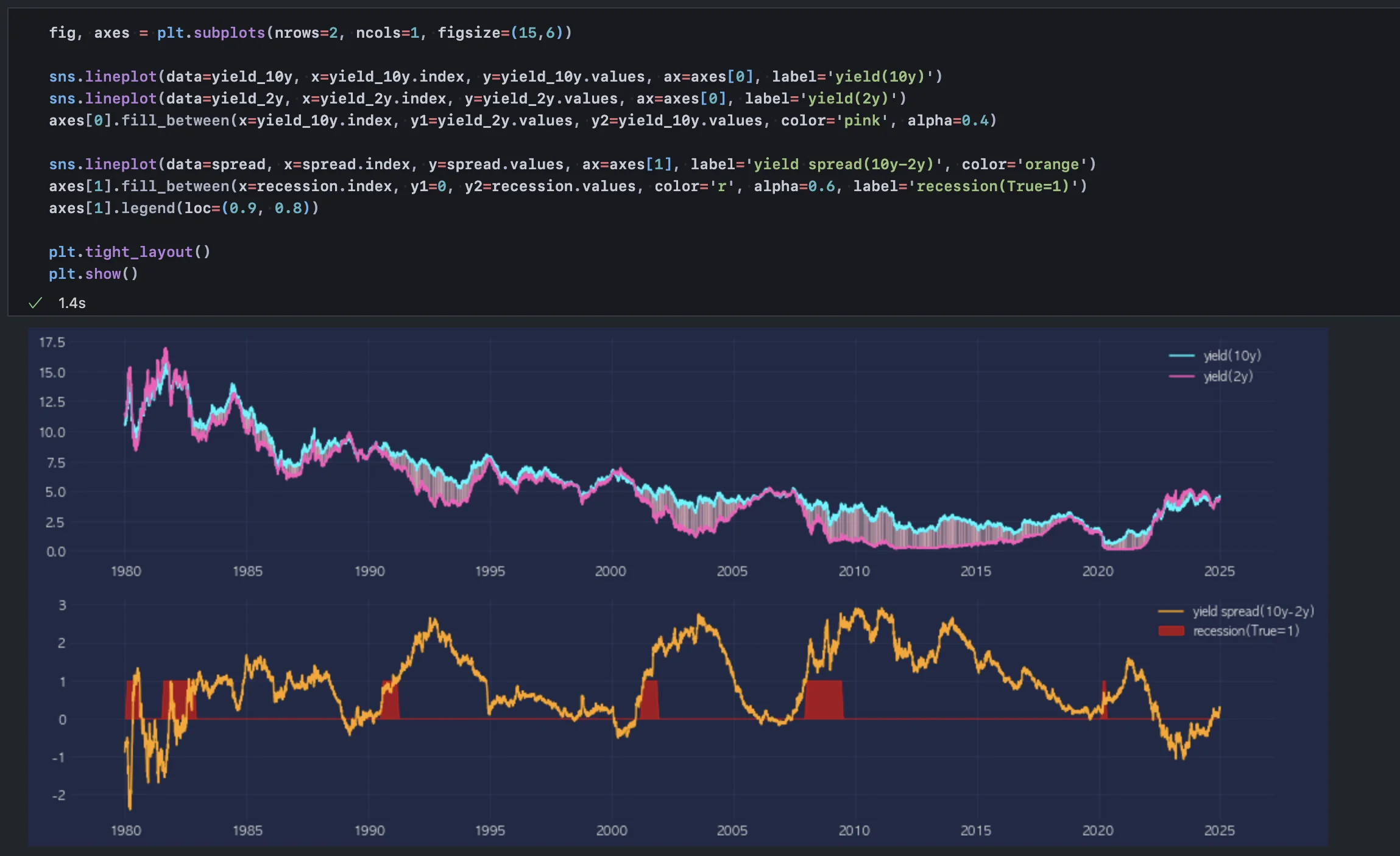 ARIMA 모형으로 금리차를 예측할 것이므로 모델 입력값으로 넣을 spread를 계산한다. 계산한 장단기 금리 spread와 역사적 recession 시계열은 아래 차트에서 확인할 수 있다. (연도별 recession 여부는 red-flag로 표시해 두었다.)