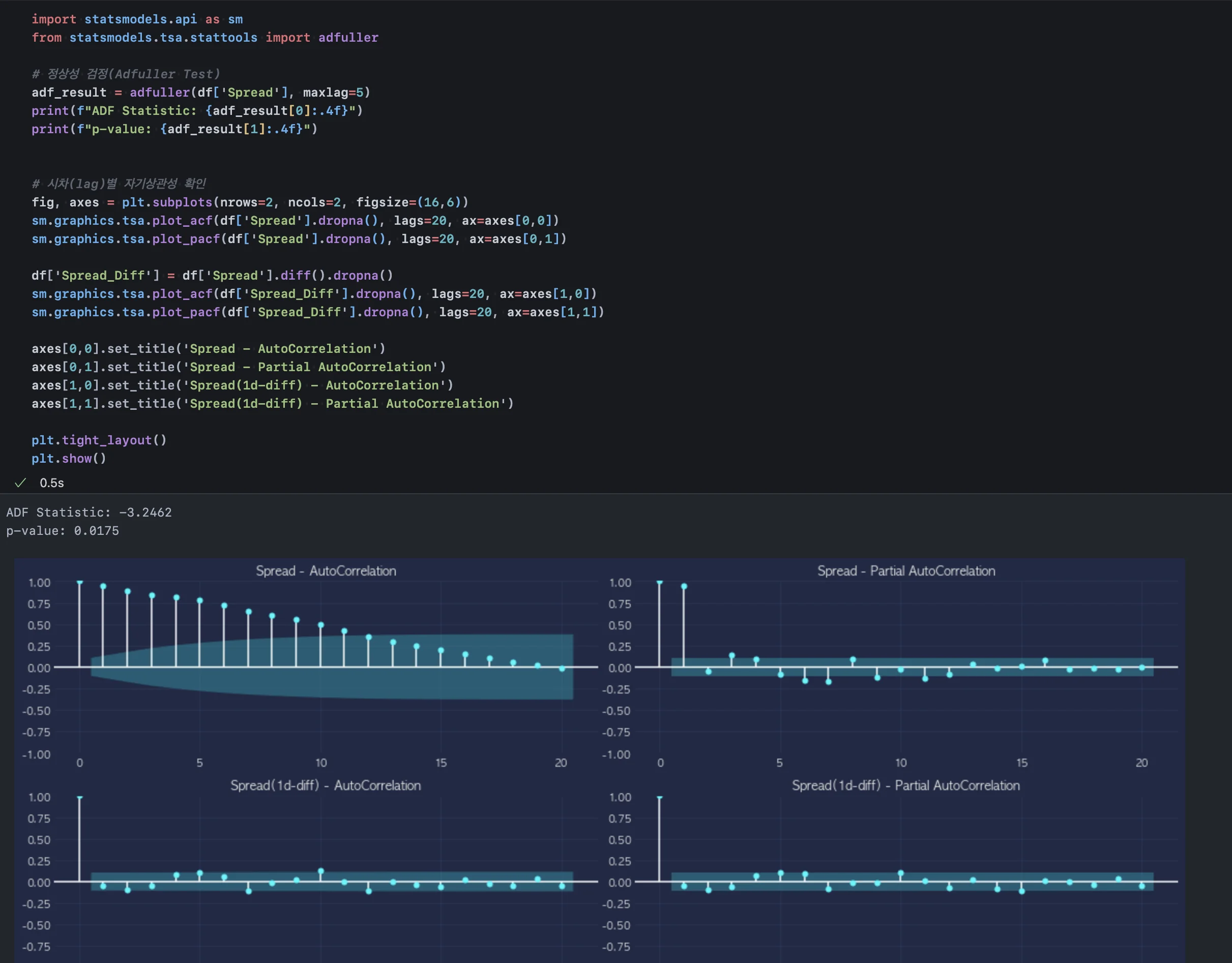 따라서 위와 같이 자기상관성, 부분자기상관성을 차트로 확인해 볼 필요가 있다. 그 결과 Spread의 시차별 Correlation을 보여주는 첫 번째 행에서 직전연도의 스프레드가 당해연도 스프레드와 매우 높은 상관성이 존재함을 알 수 있었다.
