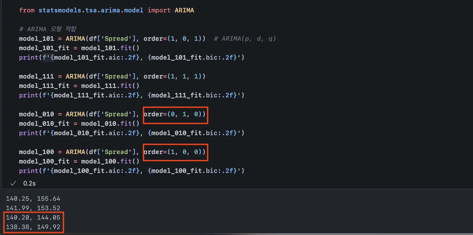 다만, 모델 파라미터(p+q+intercept)를 과하게 쓰면 aic는 낮아질지라도 bic는 그렇지 않은데, bic는 과최적화 가능성을 마이너스 요소로 취급해 주기 때문이다. 따라서 두 지표(aic, bic) 사이 밸런스를 같이 보면서 ‘최소한의 파라미터로 최대한의 적합을 이루었는가?’를 평가해야 한다.
