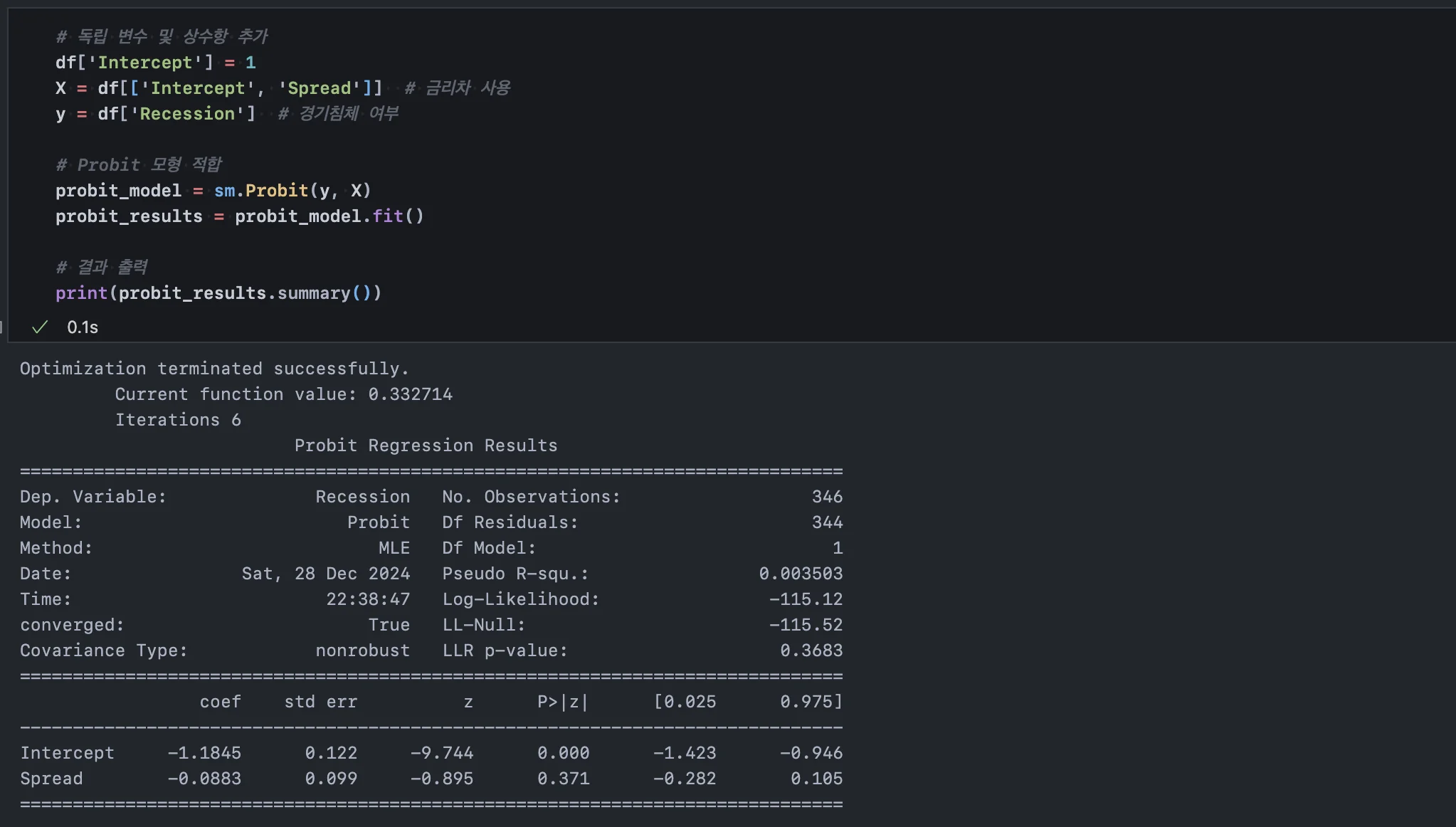 위 Probit Regression Results에서 coefficient table을 보면 Spread 변수의 coefficient가 -0.08로, Spread가 증가하면 recession 확률이 낮아질 것으로 예상할 수 있다. 그러나 해당 변수의 P-value가 0.371로, -0.08이라는 계수는 통계적으로 유의하지 않다. 따라서 spread 단일 변수로 recession을 예측하기에 Probit 모형이 충분히 적절하진 않은 것으로 보인다.