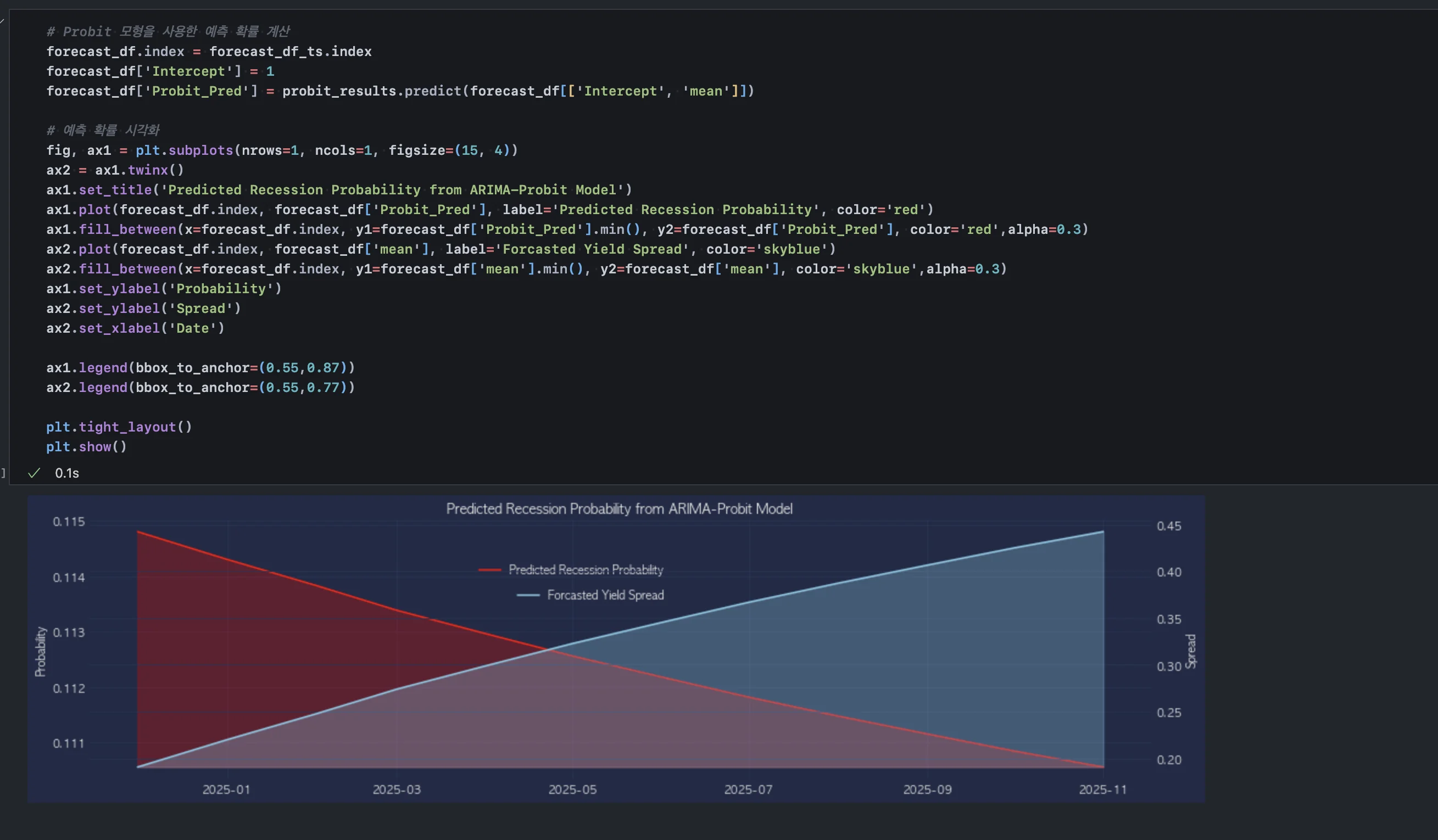 모형에서 Spread 변수의 계수는 음수이므로, 입력-출력 간에 반비례 경향성을 보인다. ARIMA(1,0,0)는 2025년 1월부터 해당 연도 연말까지 스프레드는 점차 증가할 것으로 예측했고, 이에 따라 Probit 회귀 모형은 Recession 리스크가 감소할 것으로 예측했다.