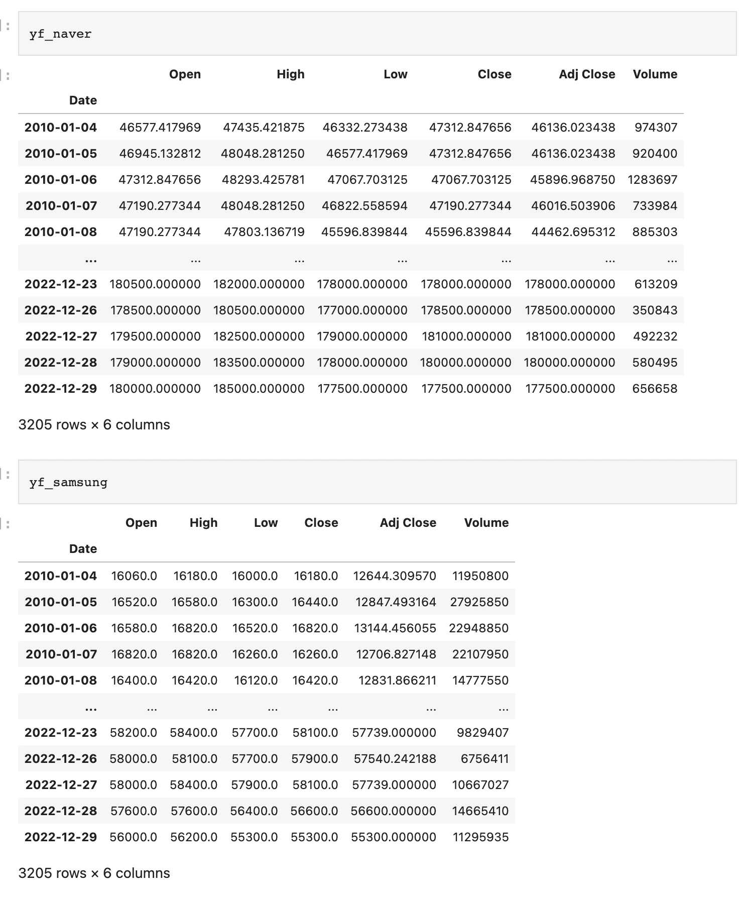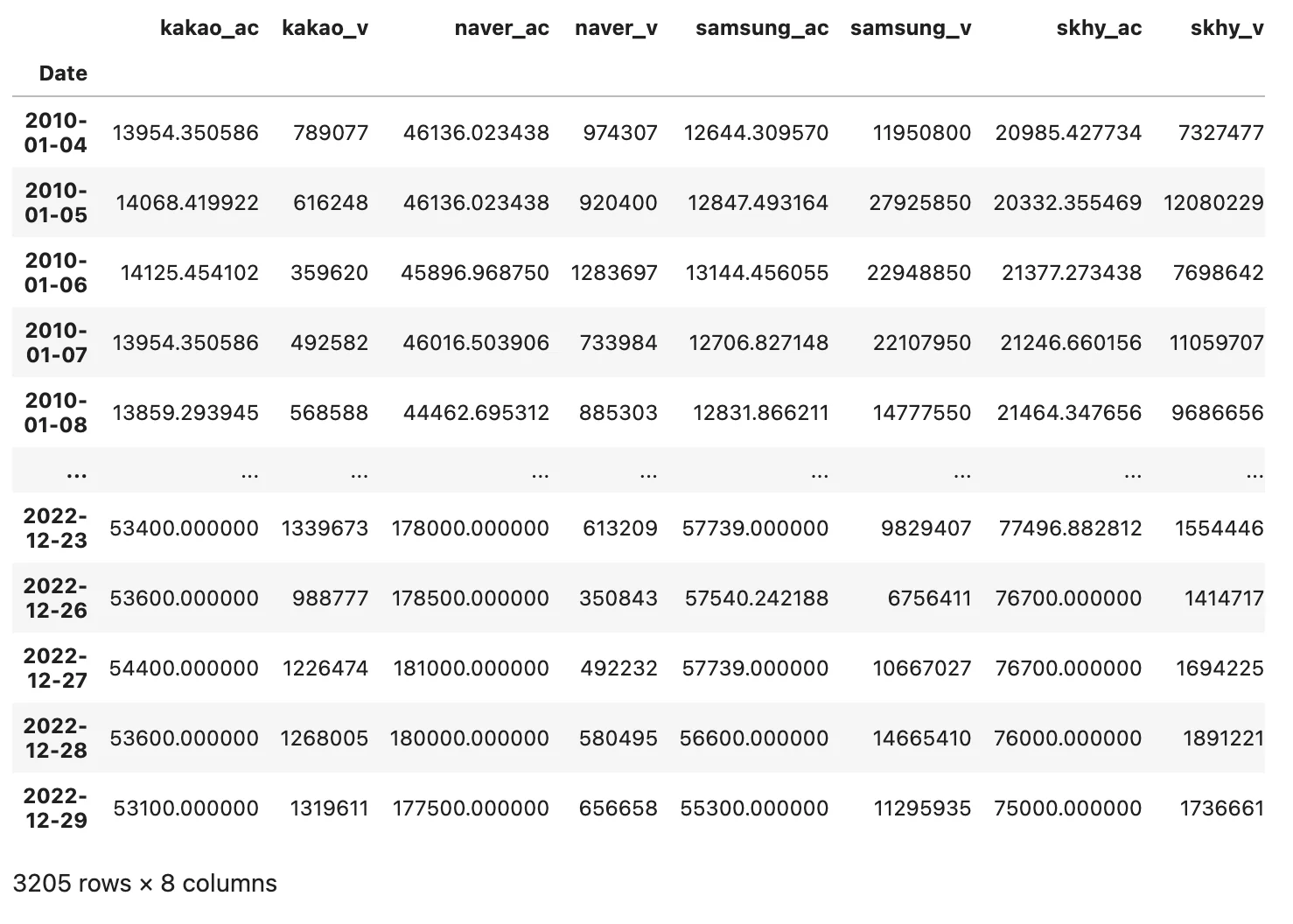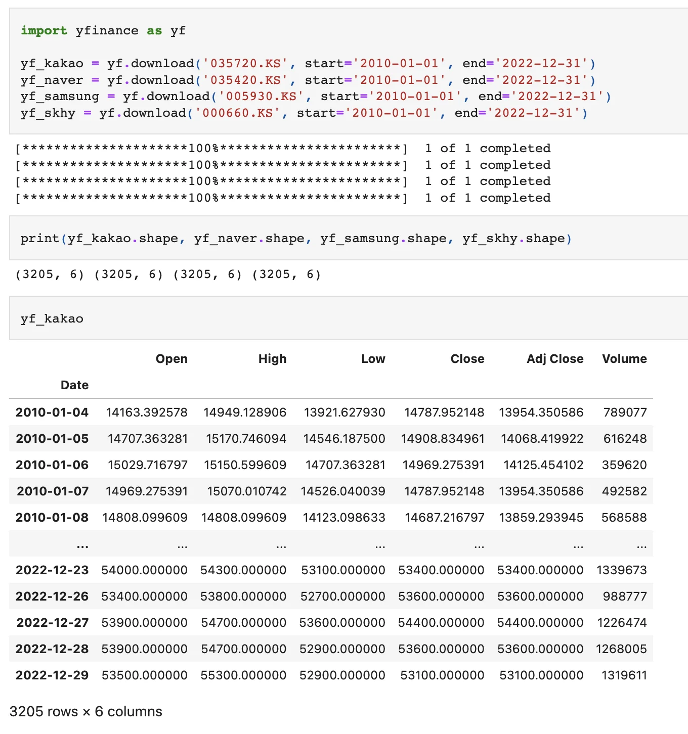 2010년~2022년까지의 카카오, 네이버, 삼성전자, 하이닉스 주가 정보를 불러온다.