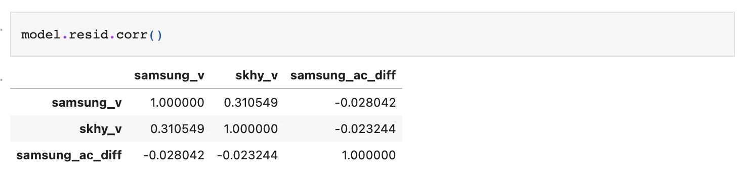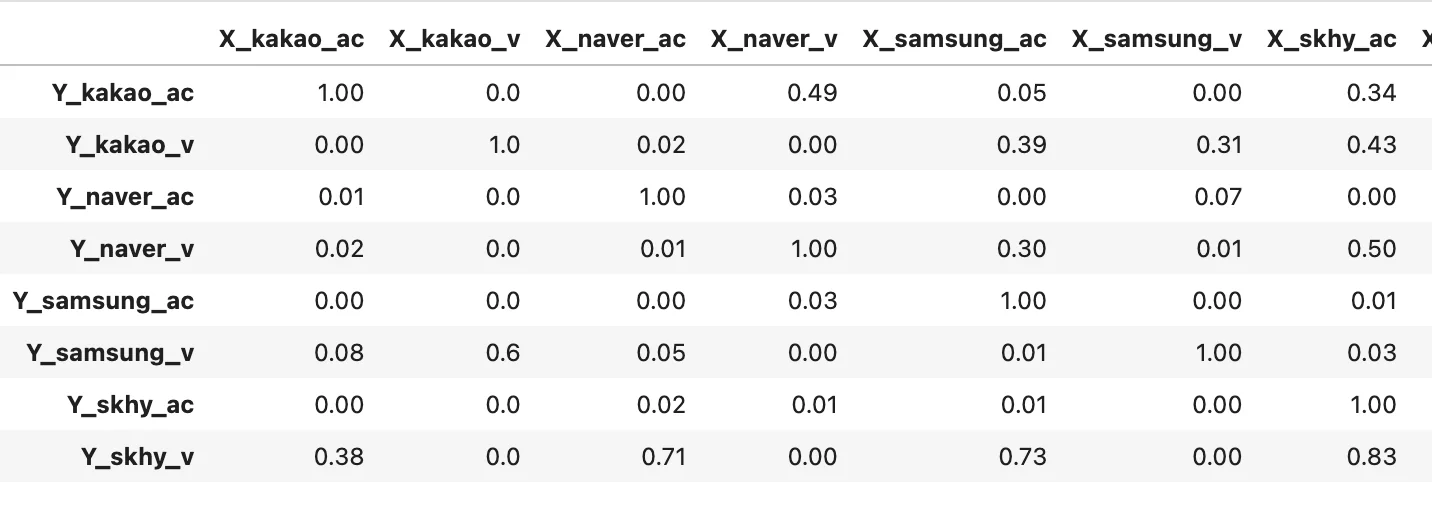 VAR 예측을 수행하기 전에 해당 변수들이 모두 상호연관성이 있는가를 확인해줄 필요가 있다.