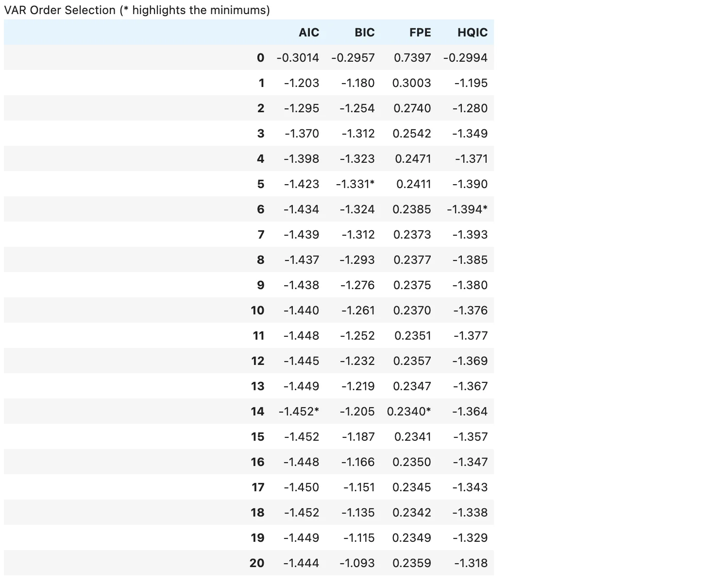 var_norm.select_order(maxlags=20).summary()