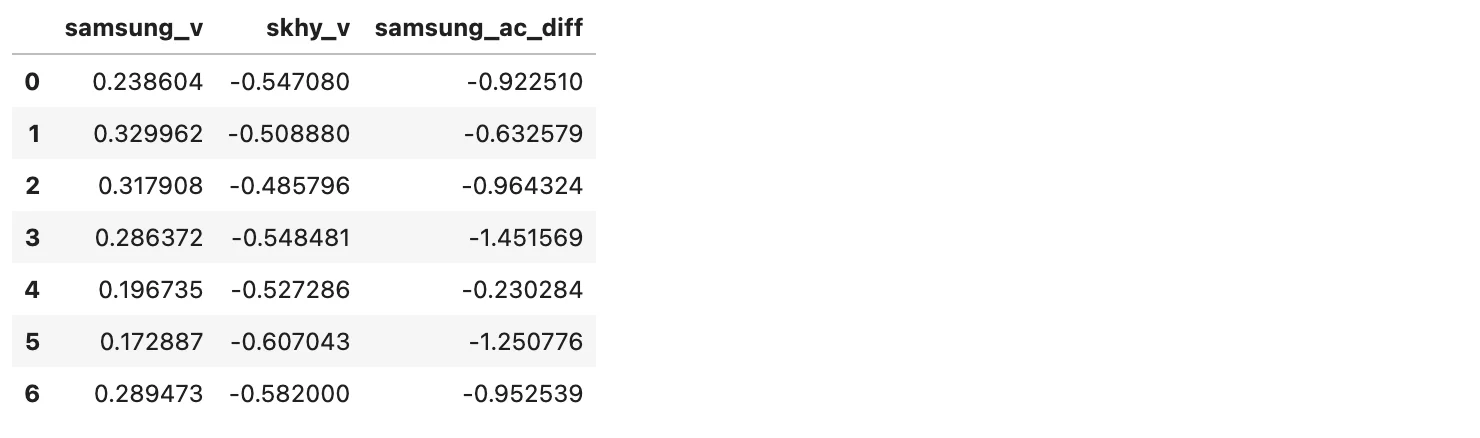- 차분 값을 음수와 양수를 2개 클래스로 나눈다.(위 시각화에서도 상승하락 여부가 같은지 유사한 프로세스로 비교하였다.)