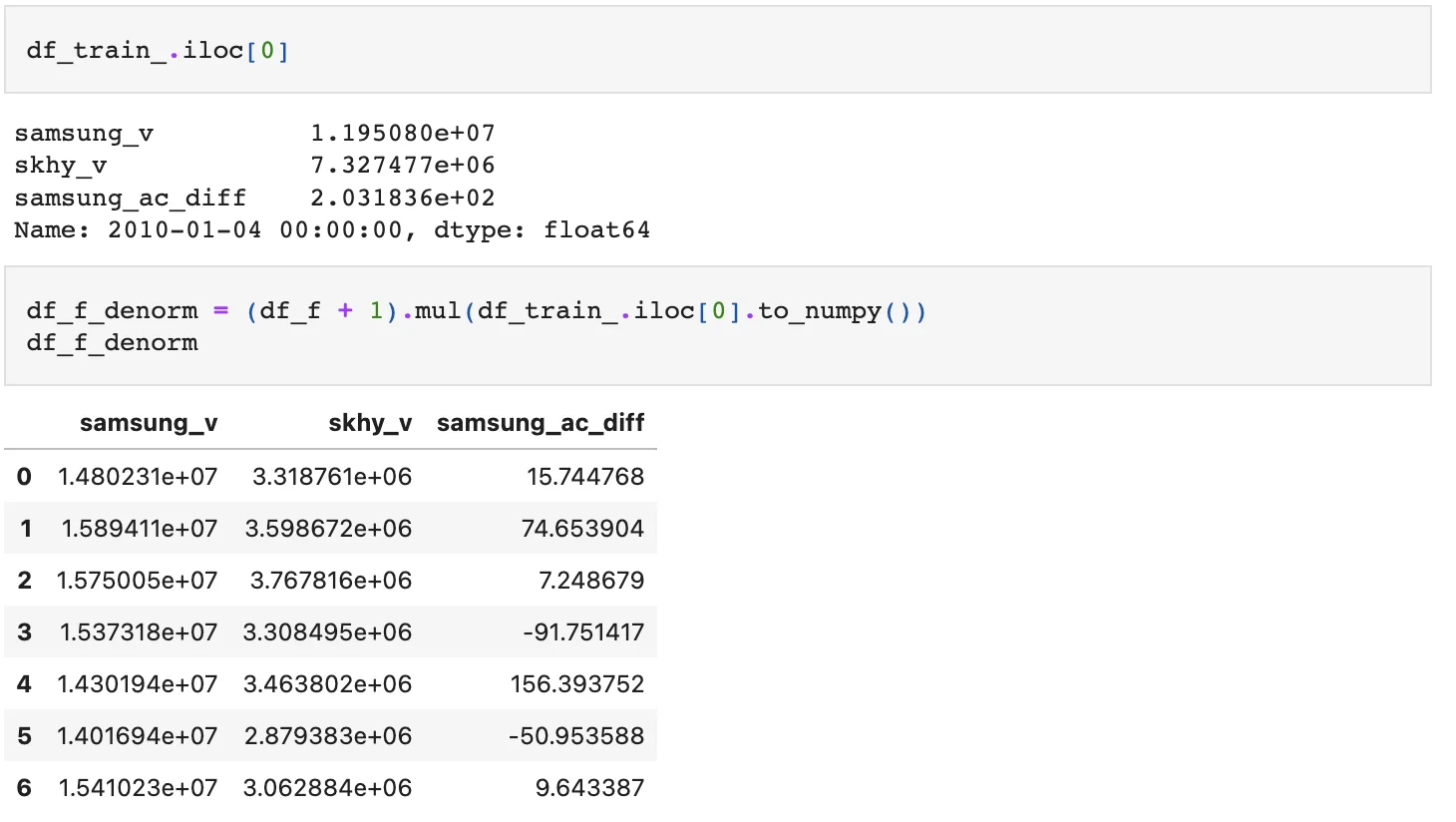 먼저 전체 데이터셋에 대해 첫번째 행 데이터 기준 정규화를 해줬으니 반대로 역정규화를 시켜주자.