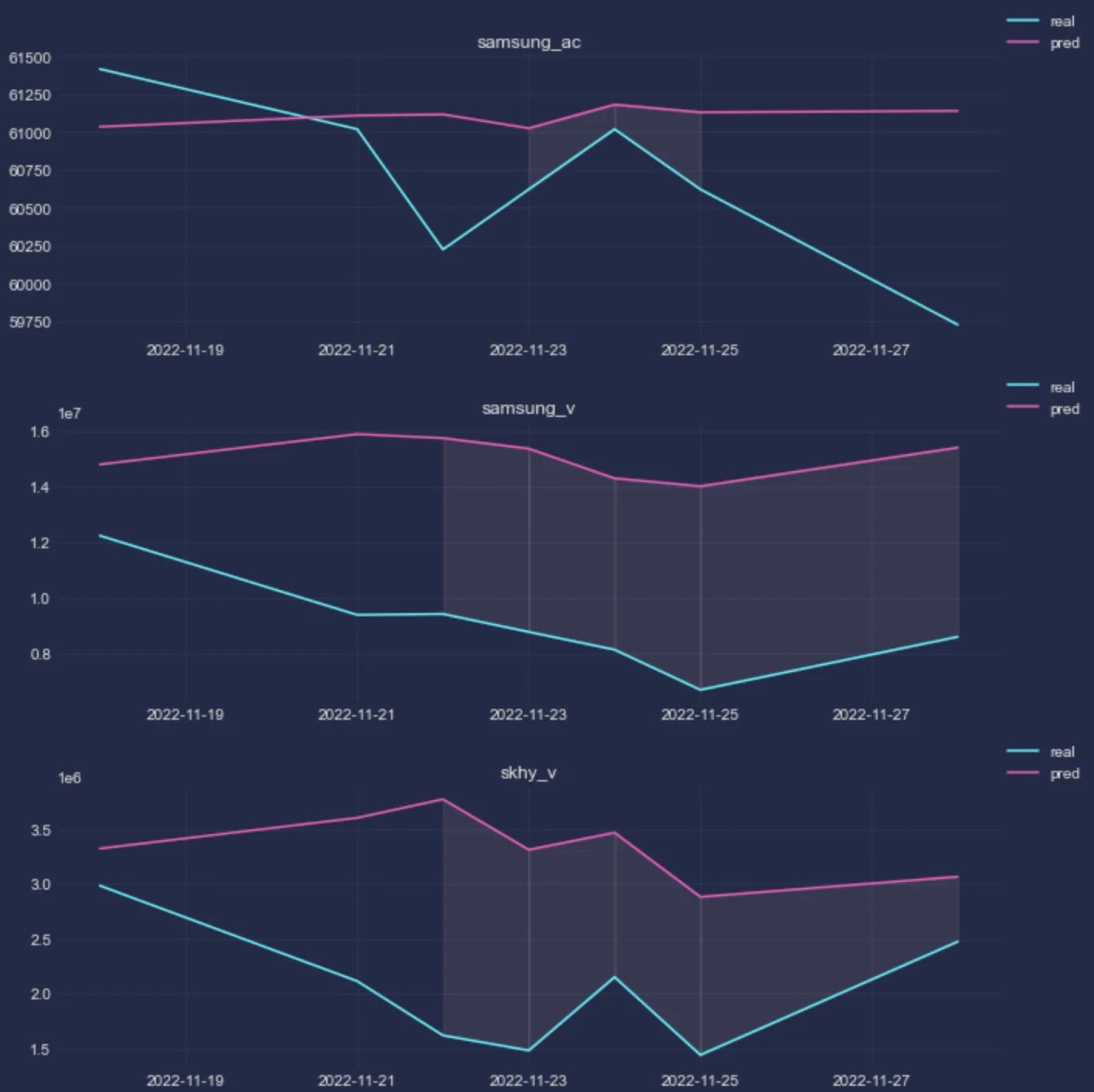 이렇게 7일간의 데이터 예측치를 살펴보았고, 상승 및 하락 여부가 일치하는 구간에는 영역을 채워줬다. 위 결과값만 놓고 보면 VAR 모형이 종가 예측보다는 거래량 예측에 더 나은 성능을 내는 것으로 보이며 추세도 어느 정도 잘 판단해내는 듯 하다.