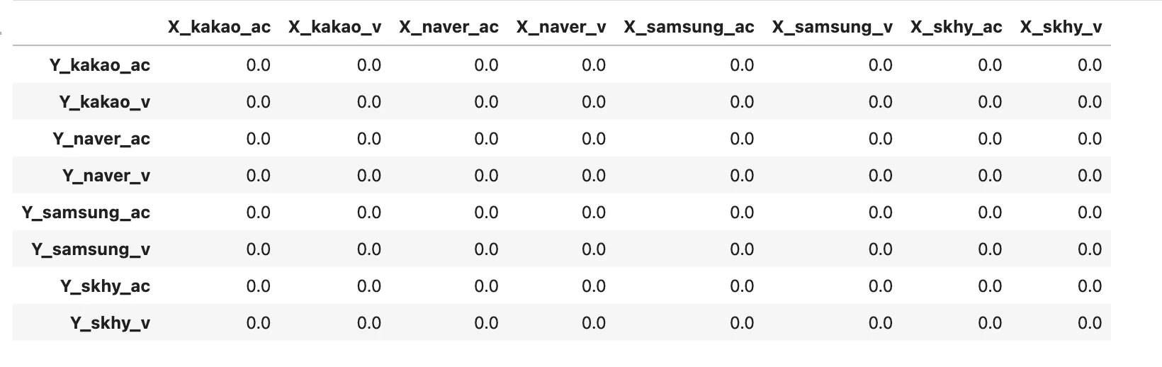 이를 위해 값을 저장할 데이터프레임을 만들어주자. 값은 우선 0으로 채운다.