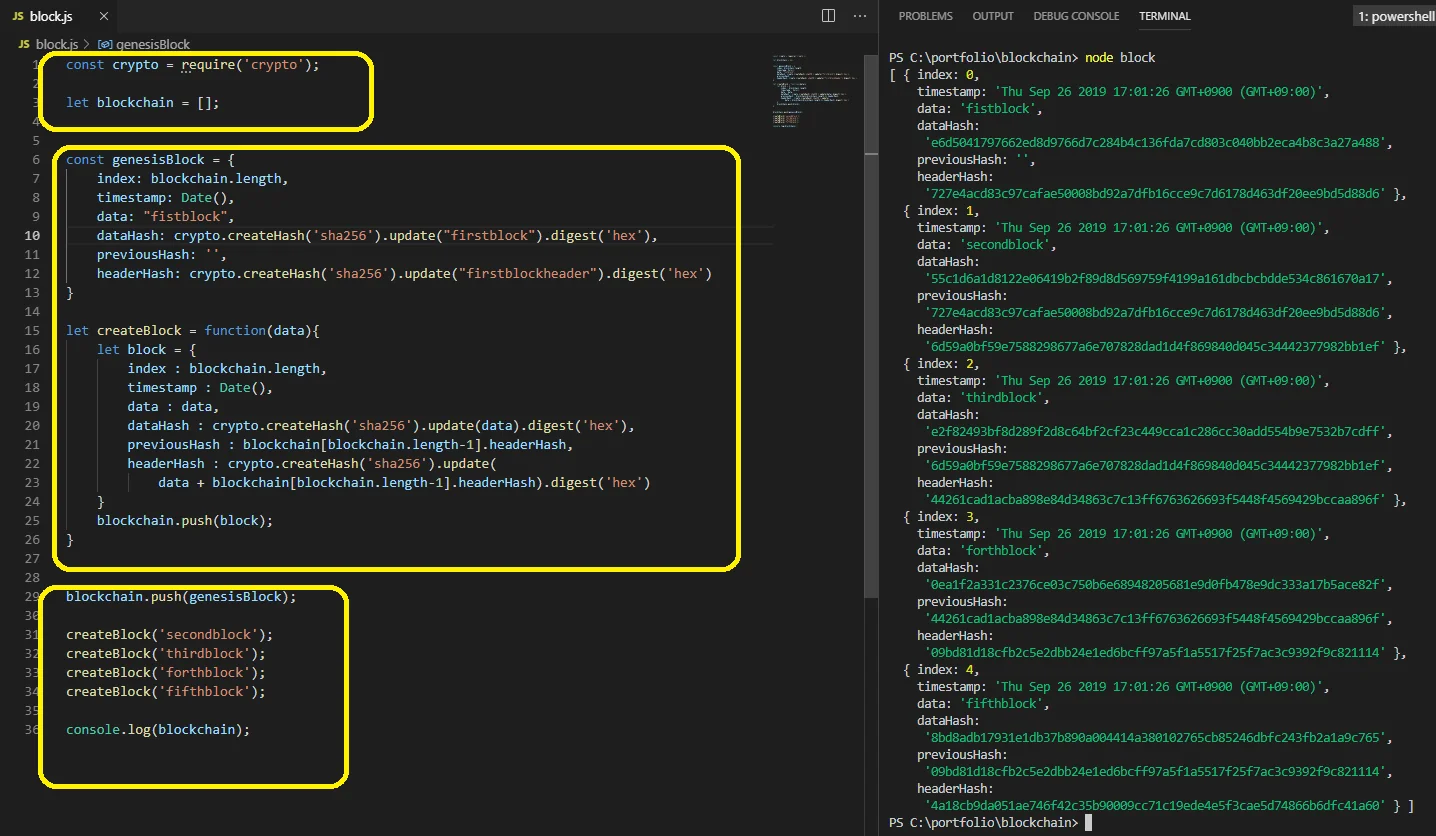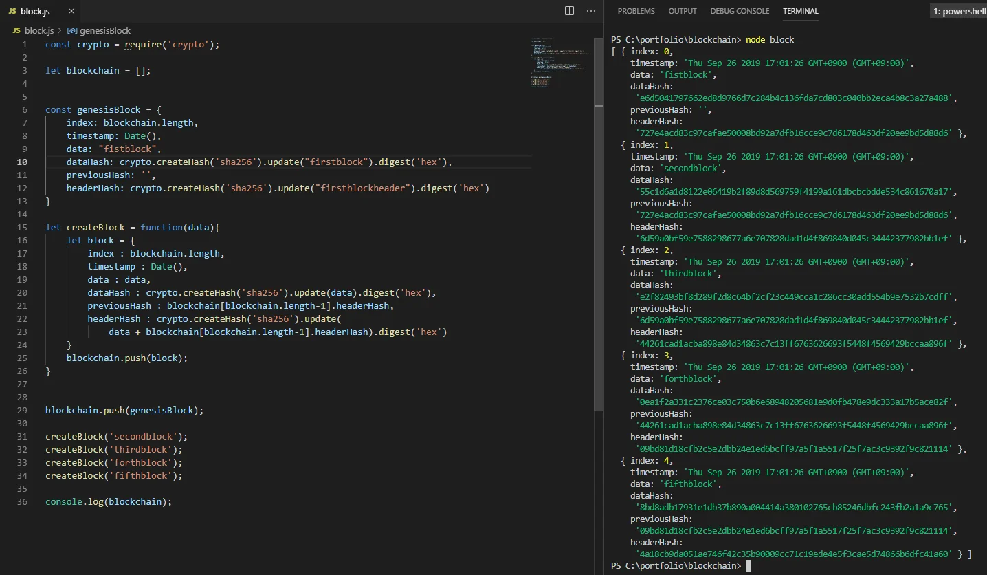 이렇게 우리는 ‘previousHash’와 ’headerHash’를 연결하는 것을 통해 미니 블록체인을 구현해보았다. 이번 실습으로 블록체인에서 해시함수가 담당하는 ’위변조를 방지하는 역할’에 대해 이해했다면 이제는 이를 기반으로 로직을 한 층씩 더 쌓아나가며 더 큰 블록체인을 만들어갈 수 있다.