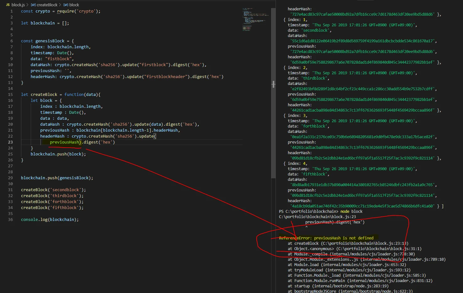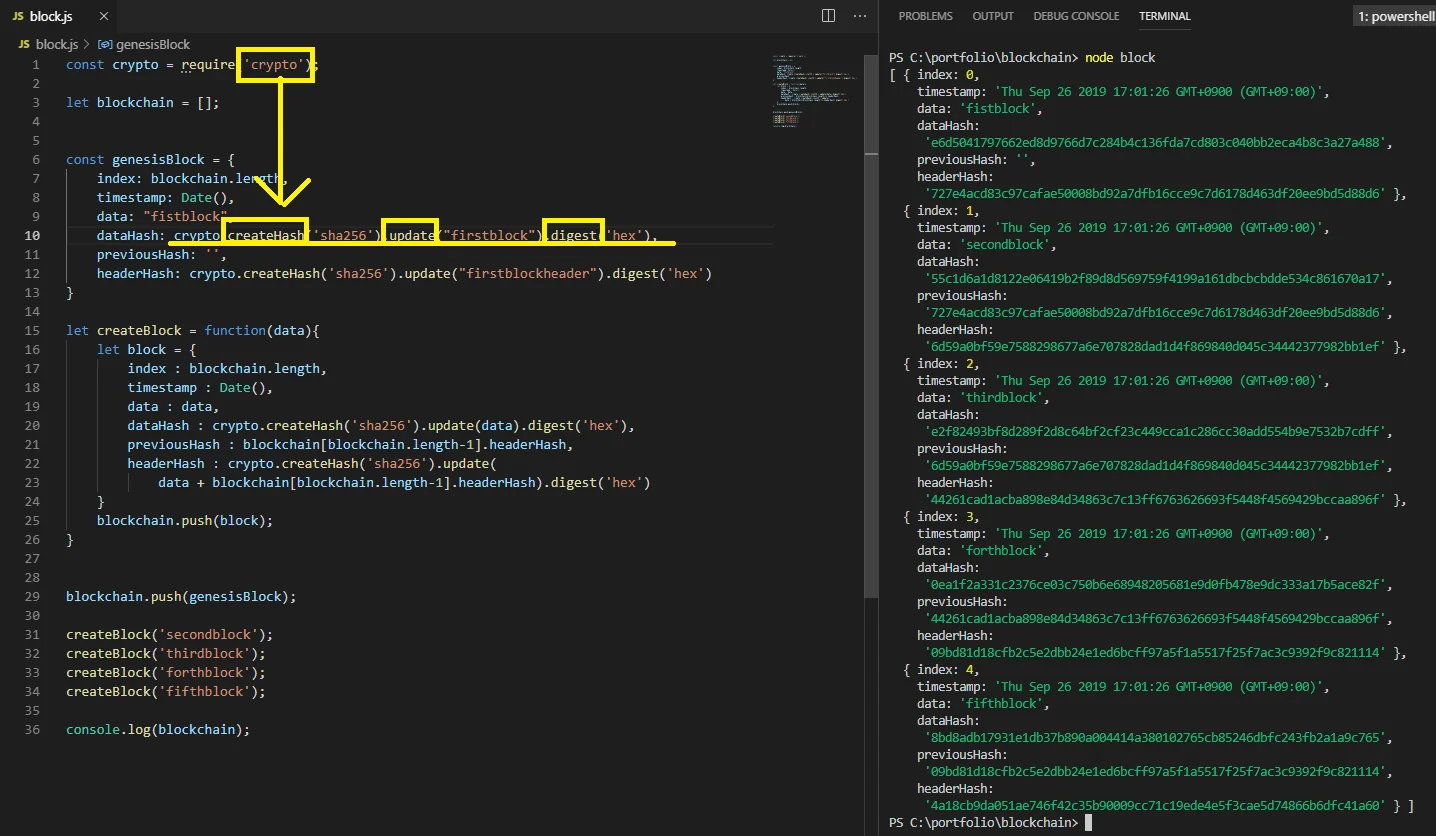 참고로, 블록을 만드는 과정에서 해시 함수를 사용할 때 주의할 점은 전역 변수로 지정하지 않은 ’headerHash’ 변수를 그대로 사용할 수는 없다는 것이다. 전역 변수는 프로그래밍할 때 스코프를 고려하지 못해 나타나는 에러로, 블록체인을 구현할 때 특히 헷갈릴 수 있다.