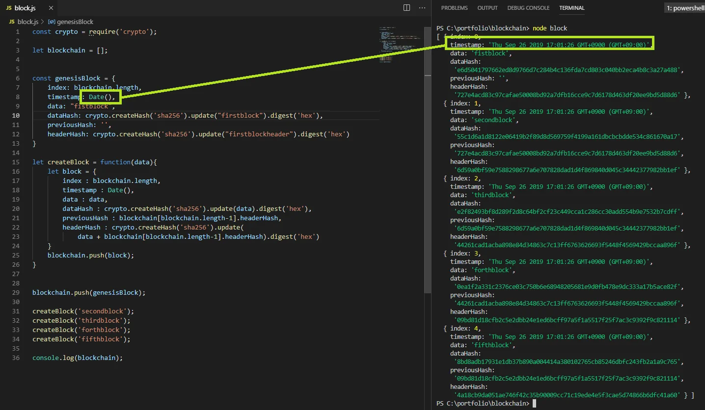 그리고 Timestamp라는 변수를 볼 수 있는데, 비트코인의 Timestamp와 조금 다르다. 비트코인에서 Timestamp는 유닉스 시간으로 1970년 1월 1일 00:00:00시부터 현재까지 경과한 시간을 초로 환산하여 저장하고 있지만 여기서는 이해를 돕기 위해 date() 함수를 통해 현재 시간을 그대로 입력받고 있다.