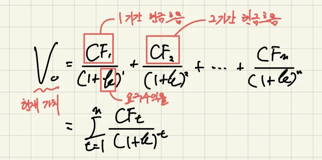 현재 자산의 가치(V)는 미래 시점 전체 현금 흐름에 각 기간별 할인율(복리)을 적용한 값과 같다. 해당 모형을 통해 채권, 주식에 대한 가치평가를 실시할 수 있다.