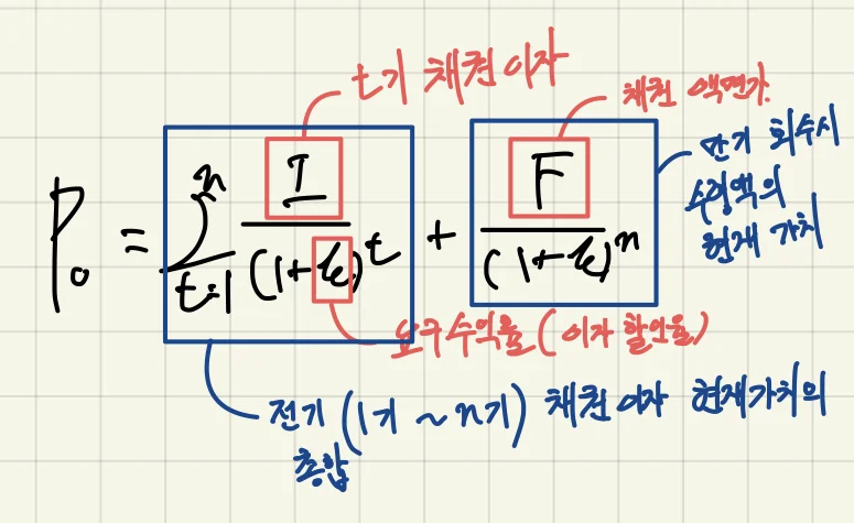 채권은 만기가 없는 채권인 영구채(Perpetual bond)와 일반 채권으로 구분하여 산식을 적용한다. 기본 채권 가치평가 모형은 다음과 같다.