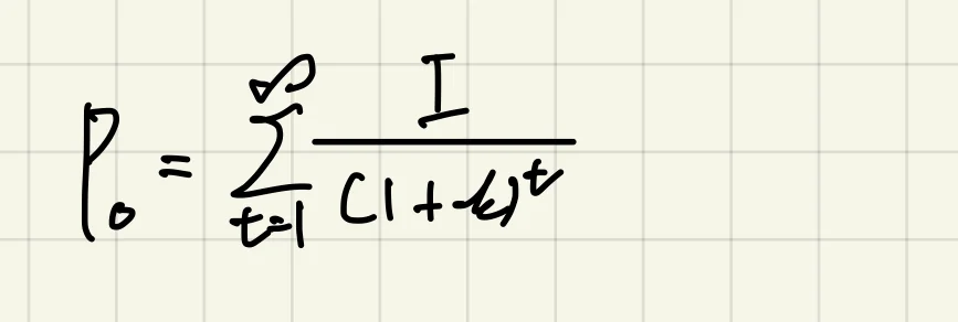 영구채는 만기가 없기 때문에(연장 가능) 이자를 무한히 지급한다는 가정을 내포한다. 이에 따라 채권 산식에서 만기 원금 수령에 대한 항이 소거되고, n은 무한대로 설정한다.