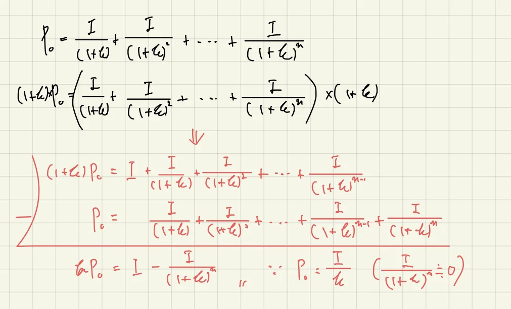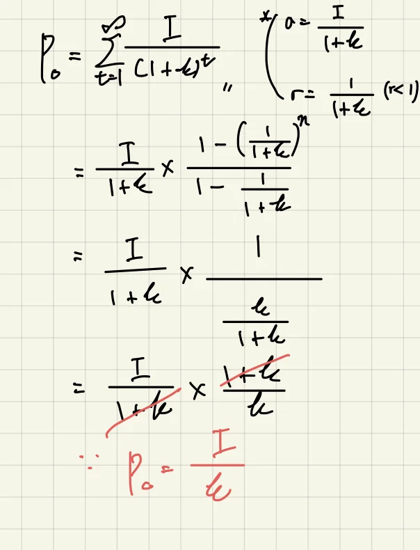 그리고 무한등비급수 공식에 따라 P = I/k로 정리된다.