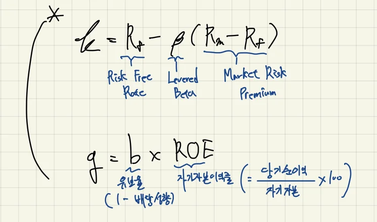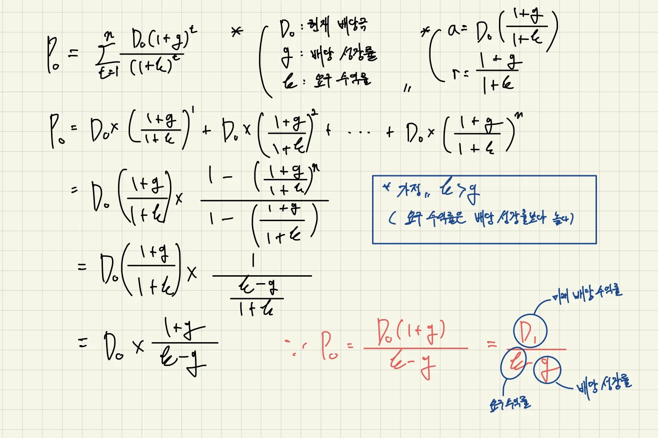 여기서 미래 자본이득 및 손실(Expected P)을 예측하는 것은 어려우므로 다음과 같이 배당 성장만을 고려해 가치평가를 수행하는 산식을 배당성장모형(=배당할인모형)이라 한다.