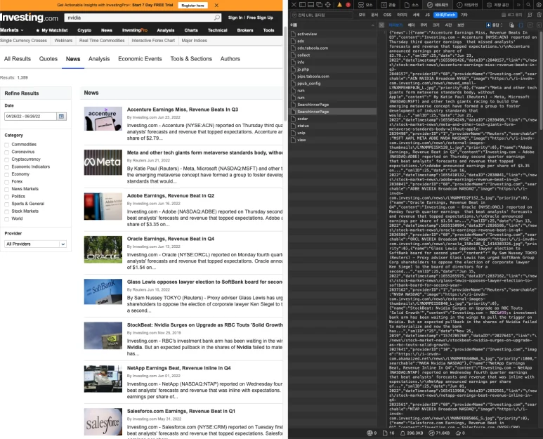 먼저 investing.com에서 엔비디아 관련 기사를 수집한다. python requests 패키지를 사용해 post 방식으로 데이터를 가져올 것이다.